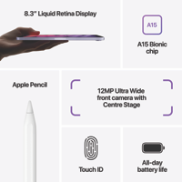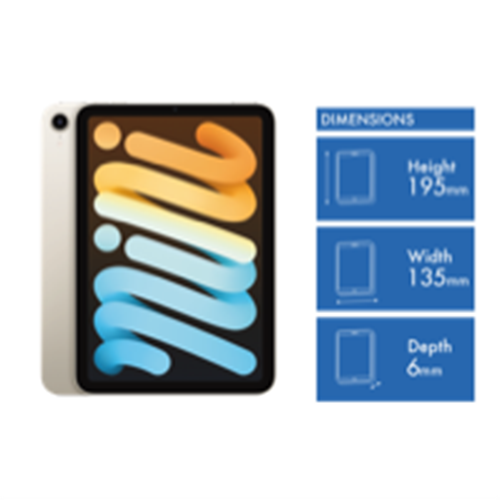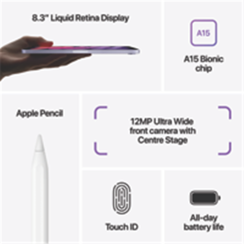 All-screen design with Liquid Retina display. Powerful A15 Bionic chip. Now in four beautiful colours. Go from inspiration to creation - any-time anywhere. Gorgeous all-screen design with an 8.3-inch Liquid Retina display that fits in the palm of your hand(1). And Apple Pencil now attaches magnetically to the side ready for all those spur-of-the-moment moments(2). Faster performance. The new A15 Bionic chip and all-day battery life let you work create and play wherever life takes you(3). Edit photos and videos play graphics-intensive games and experience unreal AR. Enjoy more natural video calls with the 12MP Ultra-Wide front camera and Centre Stage. Shoot vivid photos record 4K video or scan a document with the 12MP Wide back camera. iPad mini now supports the second-generation Apple Pencil which attaches magnetically and charges wirelessly. And a colourful Smart Folio protects iPad mini and folds into a stand(2). iPadOS is powerful and easy to use straight out of the box. And with over a million apps on the App Store designed just for iPad you'll find the right app for anything you want to do(4). DISCLAIMERS: (1) The displays have rounded corners. When measured diagonally as a rectangle the iPad Pro 12.9-inch screen is 12.9 inches the iPad Pro 11-inch screen is 11 inches the iPad Air (4th generation) screen is 10.86 inches and the iPad mini (6th generation) screen is 8.3 inches. Actual viewable area is less. (2) Accessories sold separately. (3) Battery life varies by use and configuration; see apple.com/au/batteries for more information. (4) Apps are available on the App Store. Title availability is subject to change.