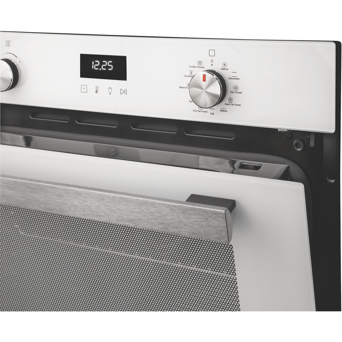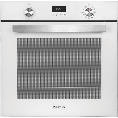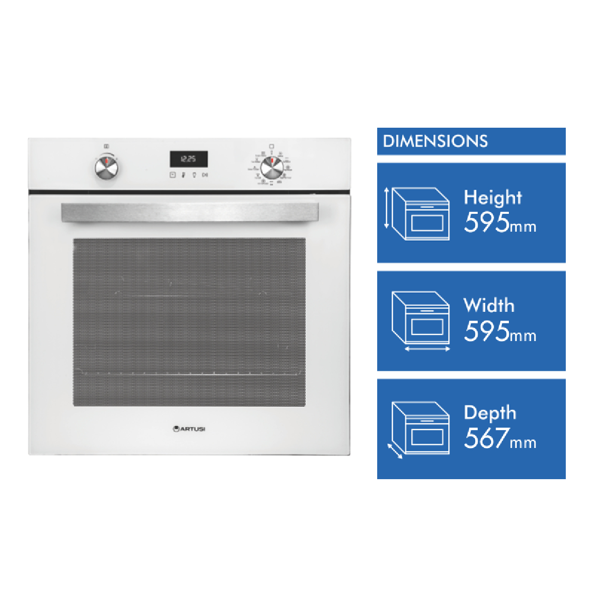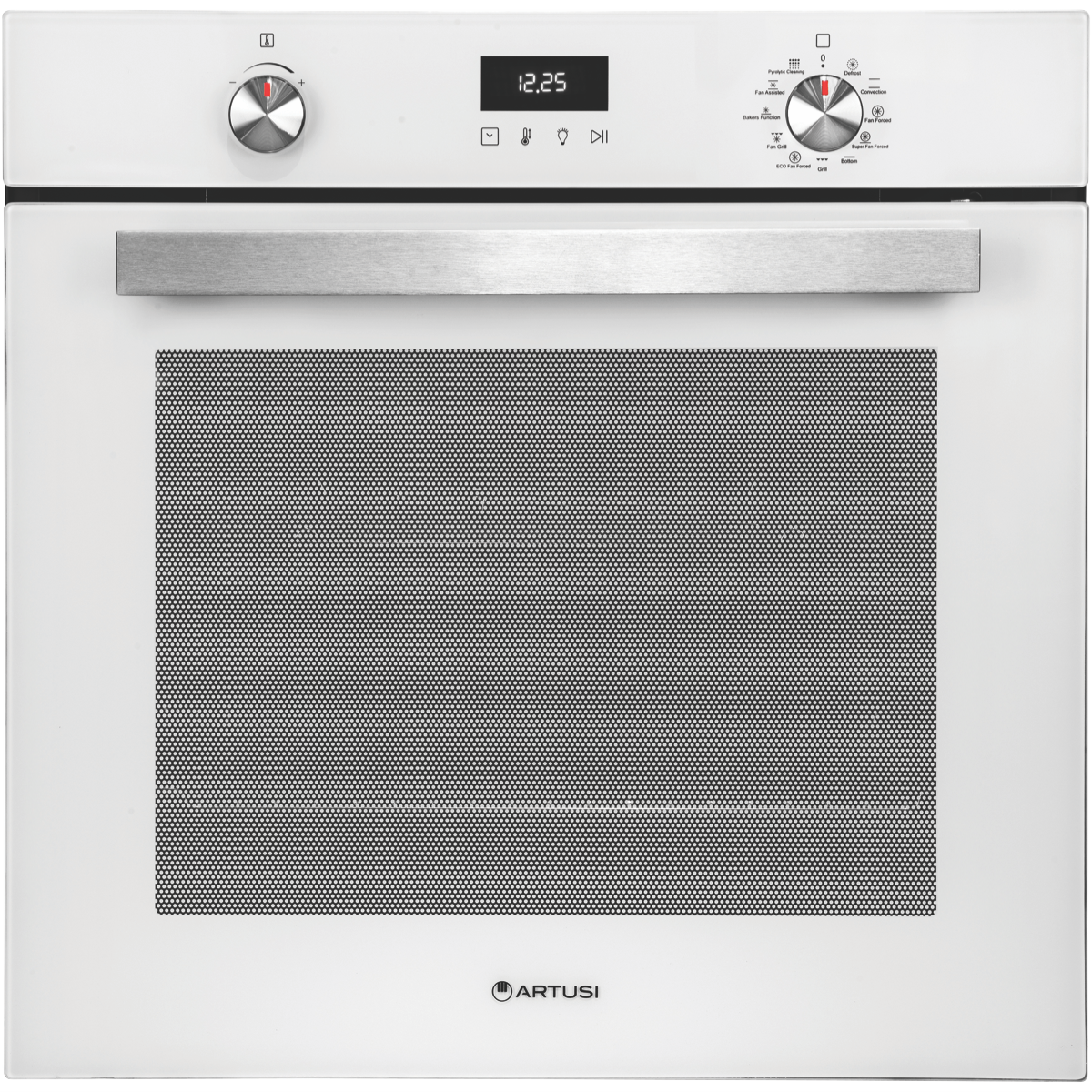 Transform your kitchen into a culinary haven with the ARTUSI 60cm Pyrolytic Oven in sleek white. This electric pyrolytic oven offers 11 functions to unleash your inner chef including convection grill bottom heat and the eco-friendly pyrolytic self-cleaning feature. With a spacious 88 litre capacity six chrome rack positions and a wide 50°C-250°C temperature range you'll have room to cook multiple dishes at once and customize each recipe. The quadruple layer glass door allows you to monitor cooking progress without losing heat while the halogen lamp illuminates the large interior beautifully. Operation is a breeze with the digital touch control timer and two sets of control knobs. Enjoy spotless oven walls thanks to the 1.15-2 hour pyrolytic cleaning cycle. This ARTUSI oven will be the centerpiece of your kitchen for years to come. The manufacturer's part number for this product is CAO610WP. Discover how this versatile oven can make meal prep efficient and enjoyable.