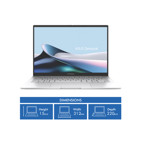 The Asus Zenbook 14 provides a portable and powerful laptop experience for work and play. This slim 14-inch laptop with a stunning OLED touchscreen packs the latest Intel Core Ultra processor and 16GB RAM to tackle demanding tasks with ease. The expansive 2880 x 1800 resolution display brings your content to life in vivid detail. With a generous 1TB SSD you'll have ample storage space for photos videos documents and more. Weighing just 1.28kg the lightweight yet durable Zenbook 14 is easy to take anywhere thanks to its compact 14.9mm thin design. The long-lasting battery keeps you powered up and productive for over 15 hours on the go. Stay connected with Wi-Fi Bluetooth HDMI USB 3.2 Thunderbolt 4 and a 3.5mm audio jack. Windows Hello facial recognition enables quick secure logins. Military-grade toughness ensures this laptop withstands the rigors of daily use. For immersive entertainment and portable productivity the Asus Zenbook 14 is a smart choice. Manufacturer Part Number UX3405MA-PZ076W. 1 year warranty.