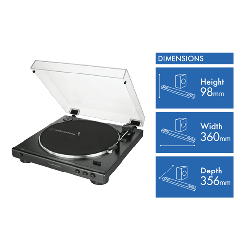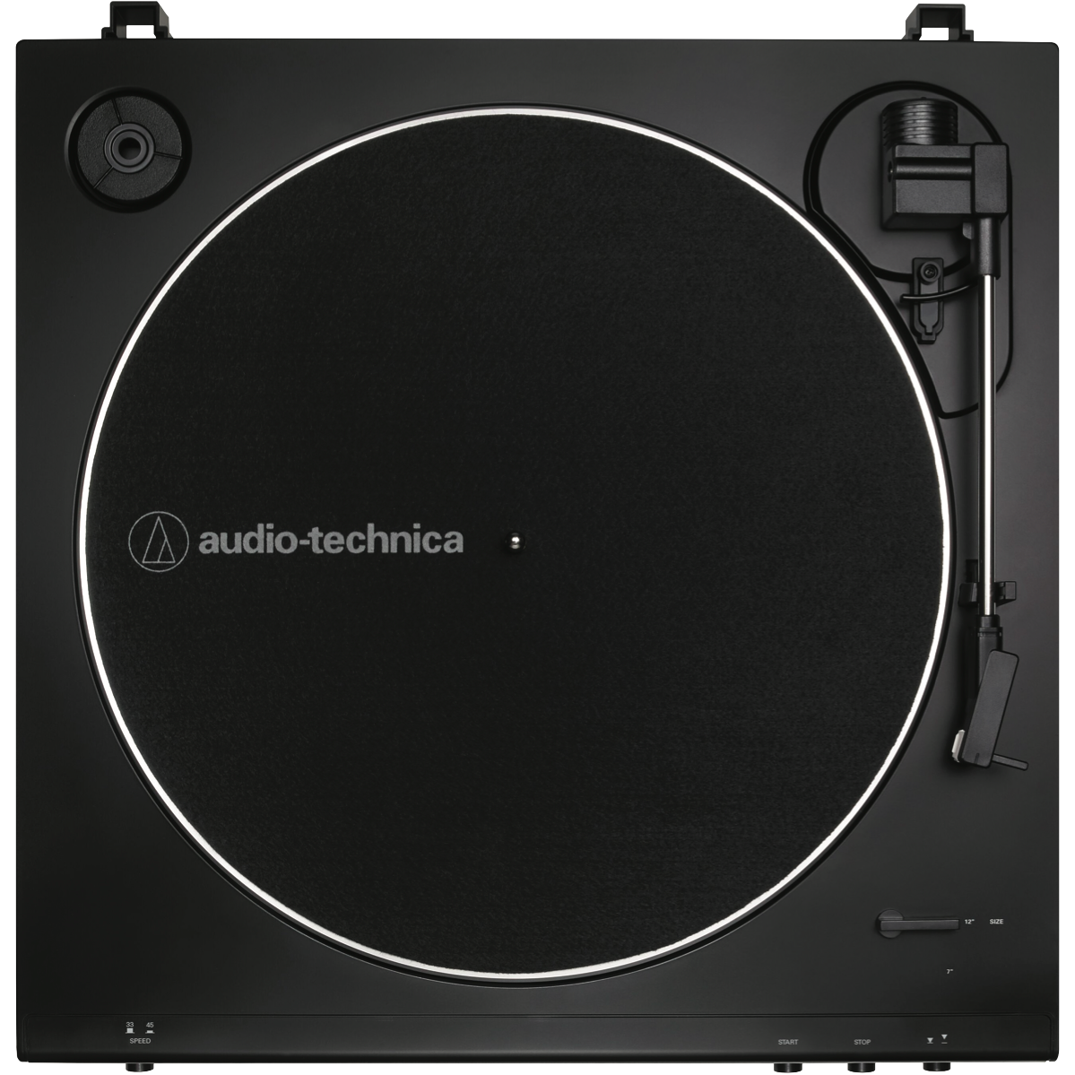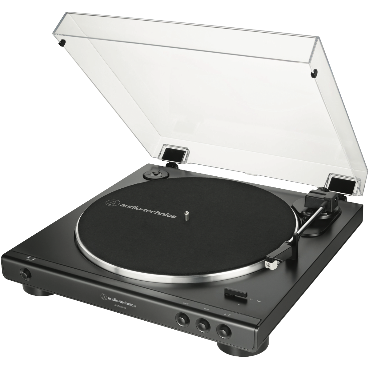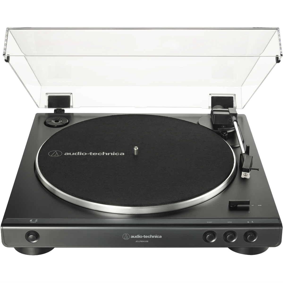Bring your vinyl collection back to life with the Audio Technica AT-LP60 belt drive turntable. This fully automatic turntable delivers a rich authentic listening experience with its anti-resonance die-cast aluminum platter and DC servo motor that minimizes vibration and reduces wow and flutter to less than 0.25%. With its redesigned tonearm and headshell you'll enjoy balanced sound reproduction with reduced tracking error. Connect to speakers or headphones via the built-in switchable phono preamp and RCA output cable. Convert your records to digital with the convenient USB port. With speeds of 33-1/3 and 45 RPM the AT-LP60 handles all of your 7 and 12 vinyl. The replaceable diamond stylus preserves your records during playback. Weighing only 3 kg the turntable's removable hinged dust cover protects it when not in use. Bring back the iconic crackles pops and richness of vinyl with the Audio Technica AT-LP60 belt drive turntable. The manufacturer's part number for this product is ATLP60XUSBBK. Rediscover your record collection today.