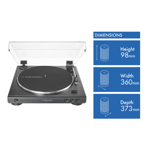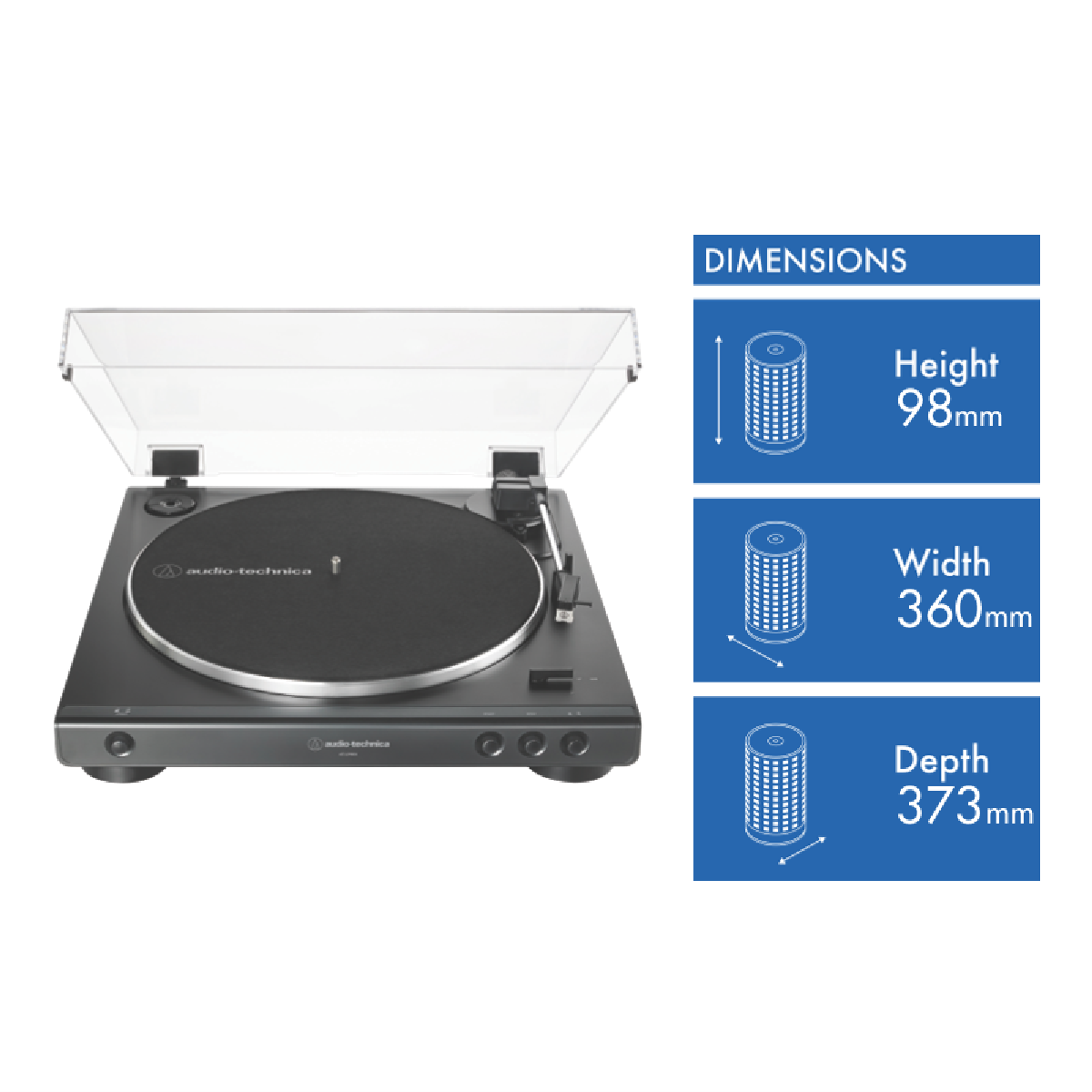Discover the true to life fidelity of vinyl with Audio Technica's Fully Automatic Turntable ATLP60XBK. Spin up a 7 inch EP or 12 inch album and enjoy AT's redesigned tonearm base and headshell optimised for excellent tracking as you play and reduced resonance for clean output. Place your records with care on the anti-resonance die cast aluminium platter and take advantage of the built in switchable phono pre-amp for phono or line level output. The included AC power adapter is not integrated inside the chassis allowing for even lower levels of interference in the sometimes noisy signal chain. Enjoy music just as it was and is meant to be with this full auto turntable.