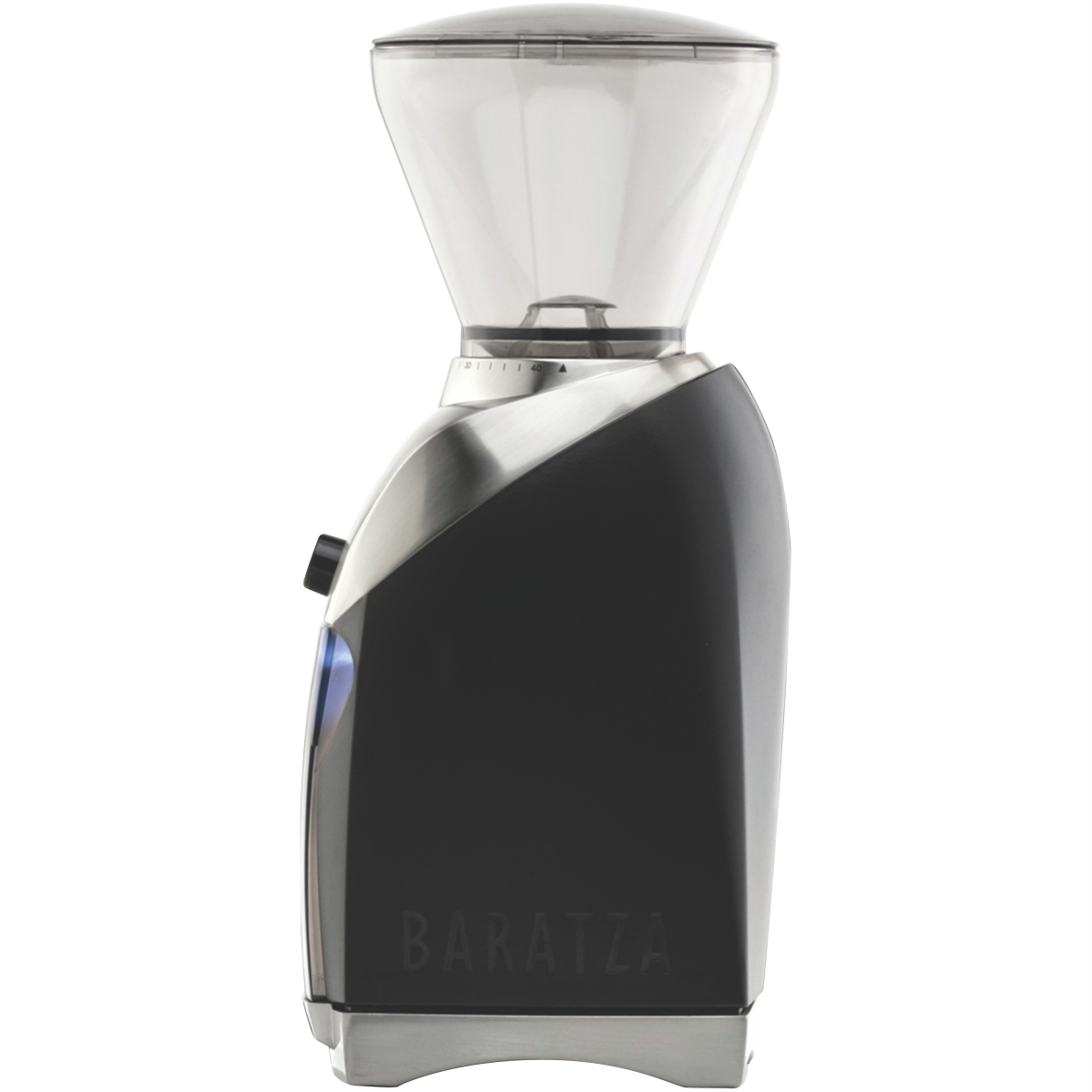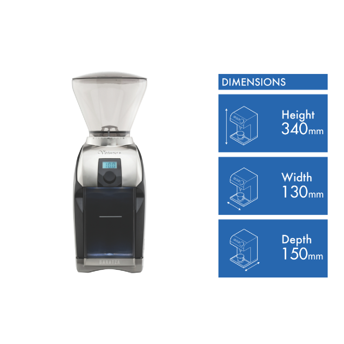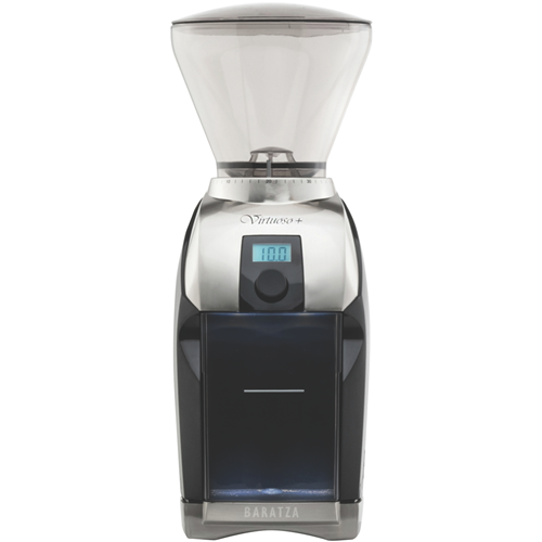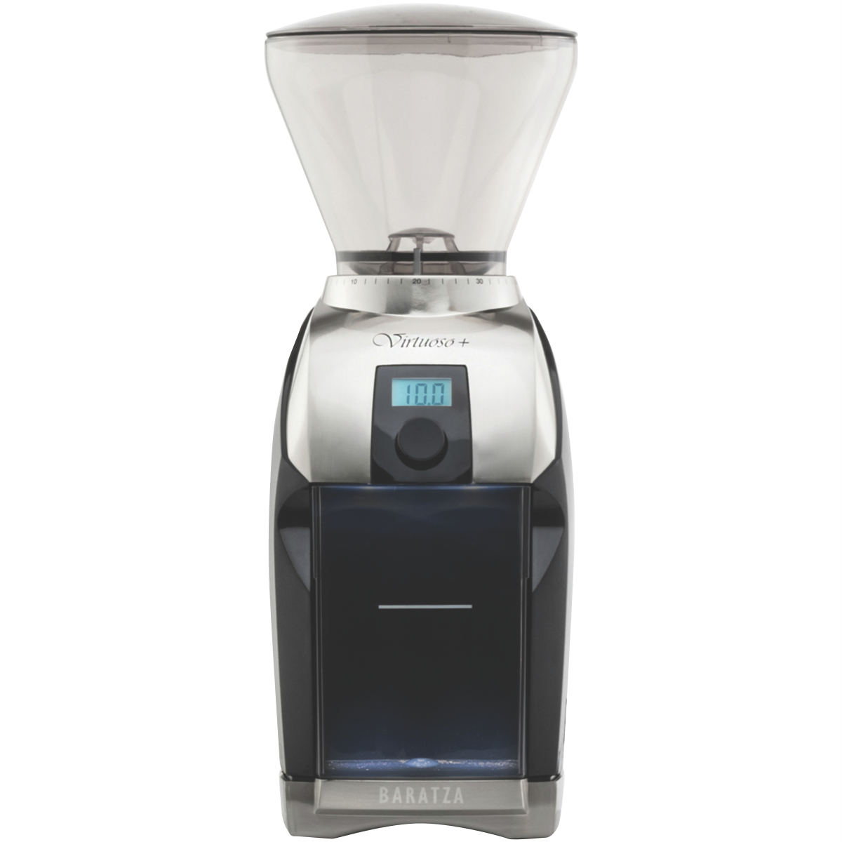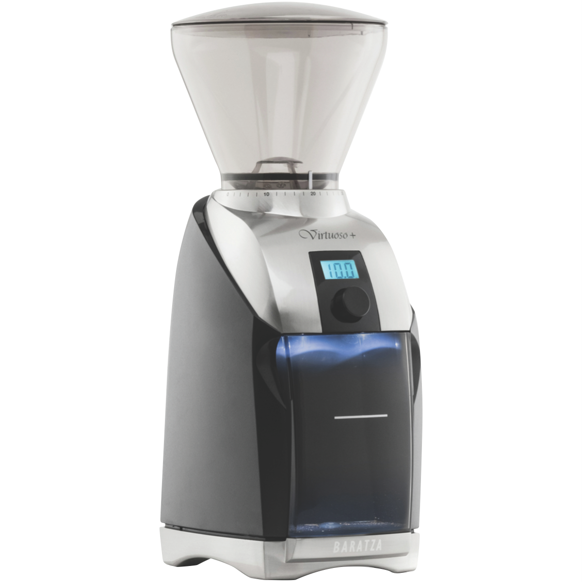 Take your morning coffee ritual to the next level with the Baratza Virtuoso+ 230V coffee grinder. This sleek black grinder lets you achieve the perfect grind for rich aromatic coffee with 40 precise grind settings to choose from. The large 300g bean hopper has plenty of room for your favorite beans while the grounds bin holds up to 120g of coffee grounds. Convenient features like the digital display LED-illuminated grounds bin and intuitive interface make operation a breeze. At the heart of the Virtuoso+ grinder are the 40mm conical burrs and gear reduction transmission engineered for uniform grinding and minimal noise. Thermal overload protection and a grounds retention system ensure reliable performance and minimal mess. With a 2 year warranty the Virtuoso+ has the quality and durability to keep your daily brew tasting amazing for years to come. The manufacturer's part number for this product is ZCG520BLK2IAN1A. Discover the joy of a perfectly ground cup of coffee with the Baratza Virtuoso+.