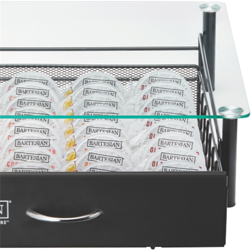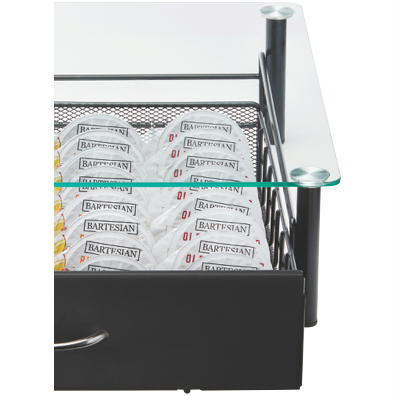 Keep your Bartesian cocktail capsules organized and ready to use with this clever storage drawer. It holds up to 36 individual capsules in one convenient spot so you'll always have your favorite drinks on hand. The drawer is built with tempered glass for a stylish look that's also durable. What makes this design really smart is that it's strong enough to support your Bartesian cocktail maker right on top saving valuable counter space in your kitchen. Part number: 168820.