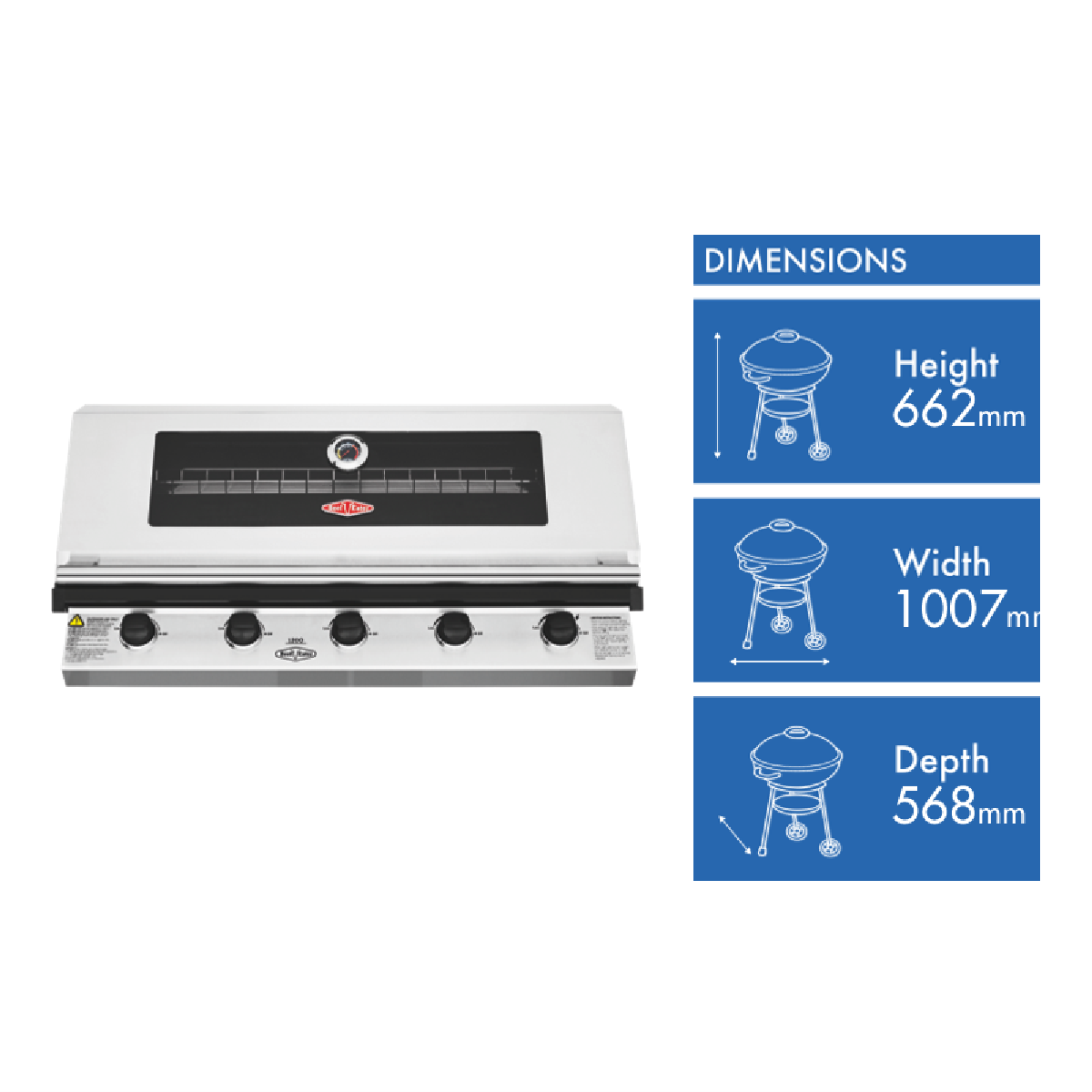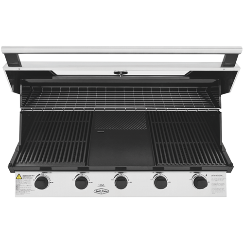 Cook up in style with the BeefEater 1200 Series Stainless Steel 5 Burner Built In LPG BBQ w/ Cast Iron Burners & Grills - Body Only BBG1250SB. Sear and seal quickly with cast iron 15 megajoule burners. Evenly grill and bake with the rust resistant cast iron cooktop. Keep an eye with the large viewing window and built-in temperature gauge to ensure the lid stays closed and roasts retain their moistness. It has a warming tray that rolls away when not in use and quartz one press start for simple ignition first time every time. The flame tamer prevents drippings from hitting the exposed fire minimising burning. Built in oil channels assist in keeping the whole setup clean and minimising scrubbing after the delicious barbeque.