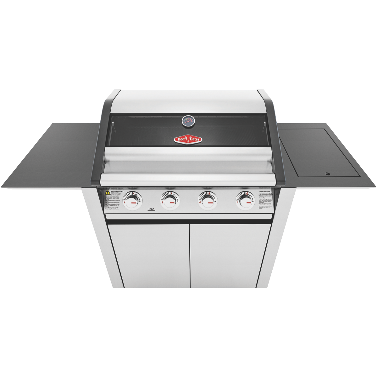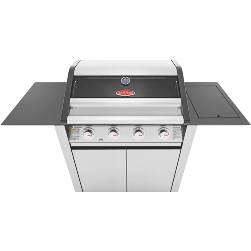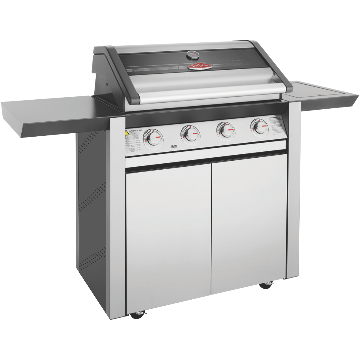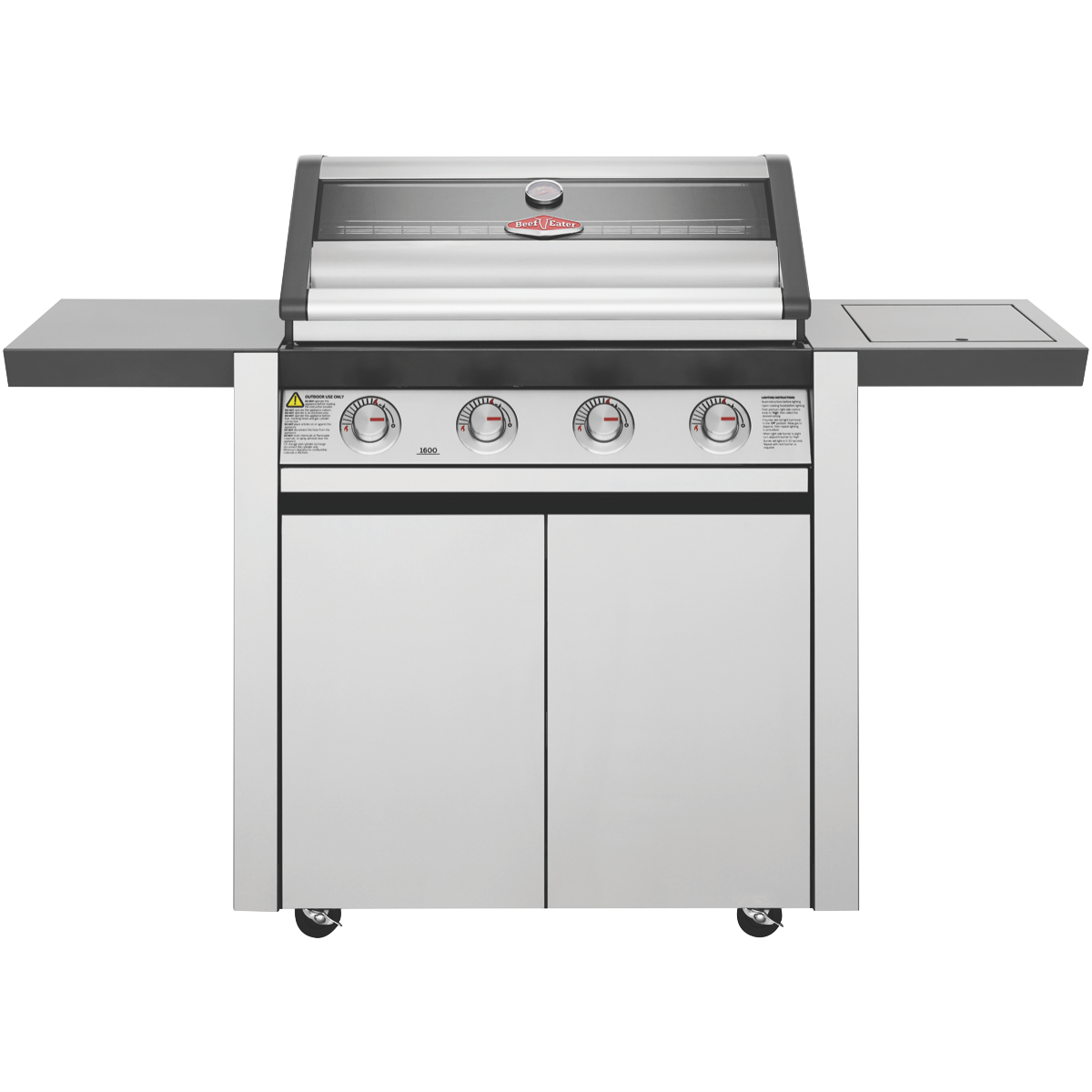 The BeefEater 1600 Series Stainless Steel 4 Burner BBQ & Trolley with Side Burner Cast Iron Burners & Grills BMG1641SA is one of the most durable flexible and efficient cooking systems available. The cast iron heats quickly maintains consistency and lasts a very long time. With 15 megajoules of power in each burner you can always turn the power up or down for precise cooking speeds. Stainless steel vaporisers efficiently disperse the flames across the grill and plate surfaces whilst reducing flare ups. Cook up a feast for many for years to come on the spacious durable cooktop. The cast iron cooking surface doesn't chip and is rust resistant yet strongly holds its warmth for the best cooking experience. Keep an eye on what s cooking without lifting the lid and maintain heat using the built in temperature gauge and peer through the full width glass viewing window to check how the sausages or brisket are doing. Start cooking quickly and easily with the quartz one start ignition that works first time every time. Built to withstand high heat over time the burner box is built of high grade enamel. Fully seam welded throughout moisture and grease can't get into the gaps to create rust. Designed for an easy clean-up the hotplate has raised sides preventing grease & oil over spilling drawing it instead to the plate opening and into the front access catchment tray. Turn the hotplate burners up for searing and the grill burners down for slow cooks. Get a practical BBQ trolley with ample storage for gas cylinders and barbeque accessories along with spacious side shelves. The bump stop trolley feature prevents pushing the BBQ directly against the wall providing extra ventilation and preventing damage when rolled back.