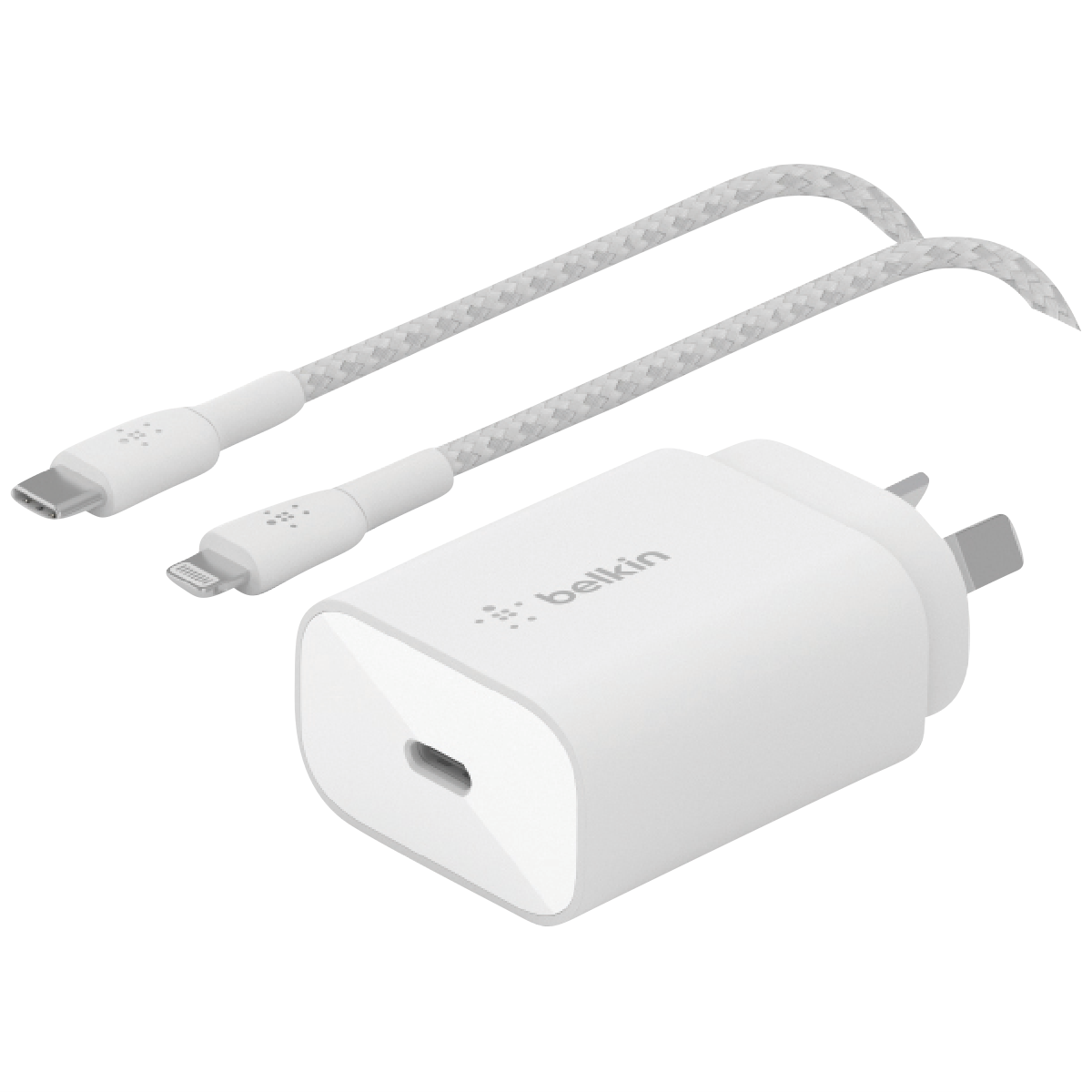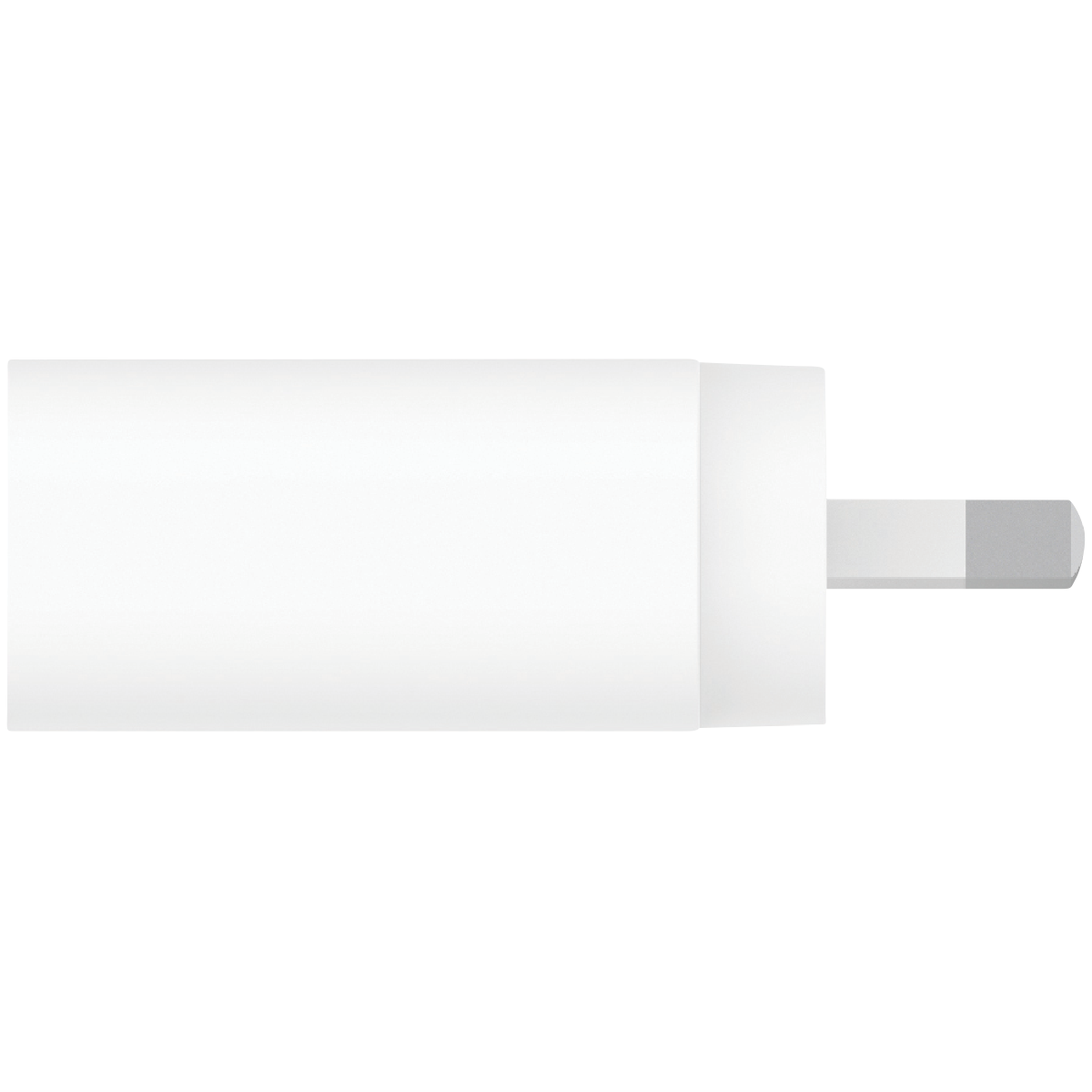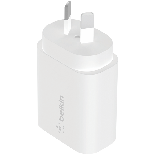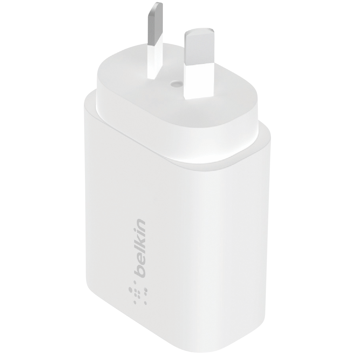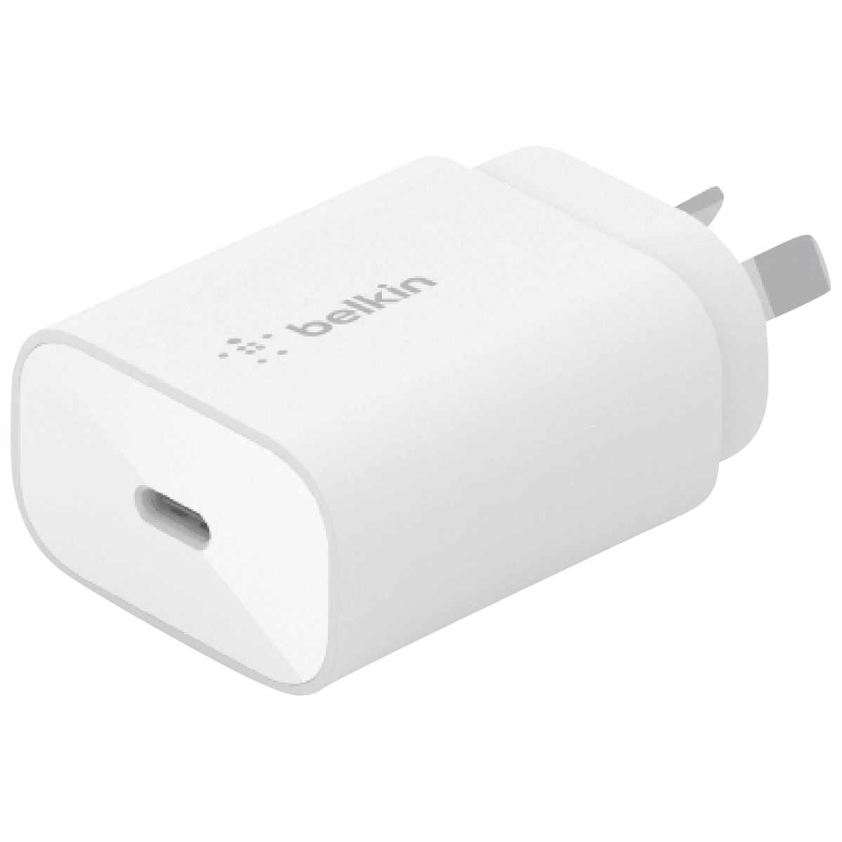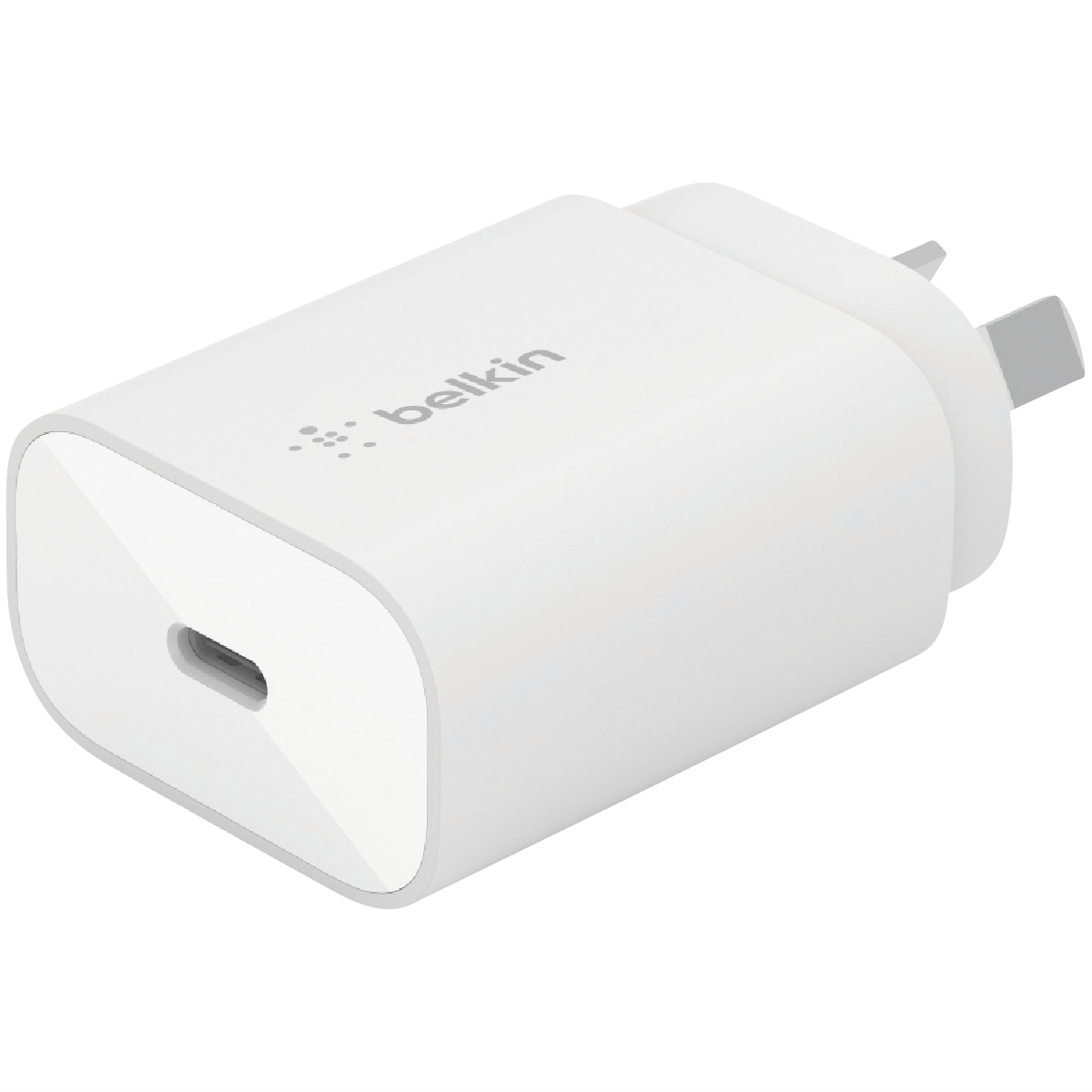Charge on the go with the Belkin BoostUp 25W PPS USB-C PD Wall Charger. This power adapter lets you rapidly charge your phone or tablet thanks to its 25-watt power delivery output. The compact design is ideal for travel fitting neatly into any bag or purse. The USB-C port works with the latest phones tablets and laptops supporting USB Power Delivery. Get up to 50% charge in just 30 minutes with compatible devices. The durable lightweight build ensures this charger will keep up with your active lifestyle. It comes with a two year manufacturer's warranty for peace of mind. Experience next-level charging speed in a portable form factor with the Belkin BoostUp. The manufacturer's part number for this product is WCA004AUWH. Get your BoostUp charger today for high-speed charging anywhere.