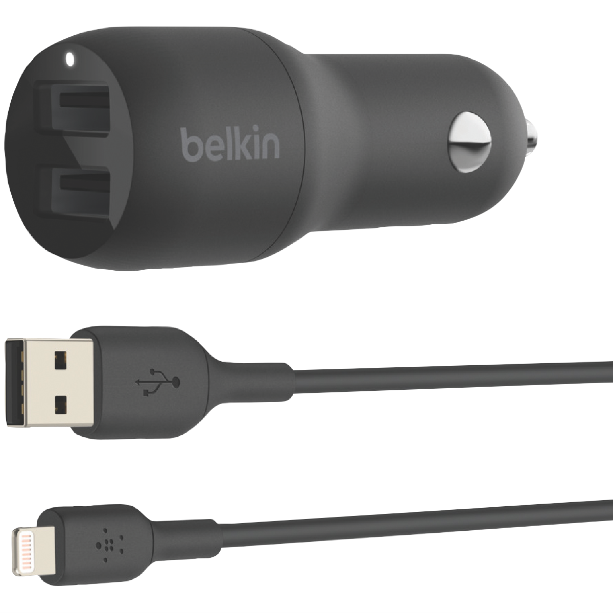 Step into your car with the Belkin Dual 24W Car Charger and Lightning Cable ready to power up your devices on the go. This convenient charger features two USB ports to juice up two devices simultaneously with 24 watts of shared power to quickly get you back up and running. The attached Apple MFi-certified Lightning cable ensures seamless charging and syncing with your iPhone or iPad while the durable nylon-braided cable resists fraying and tangling. With a lengthy 4 foot cable passengers in the back seat can stay powered up and entertained. Compact and lightweight this charger easily fits into your glove box or console when not in use. Designed for iPhone iPad iPod and other USB devices this Belkin charger makes road trips and daily commutes easier. For reliable charging you can count on choose the charger trusted by millions worldwide. The manufacturer's part number for this product is CCD001BT1MBK. Get the Belkin Dual 24W Car Charger and Lightning Cable to keep your devices charged on the go.
