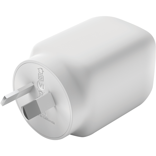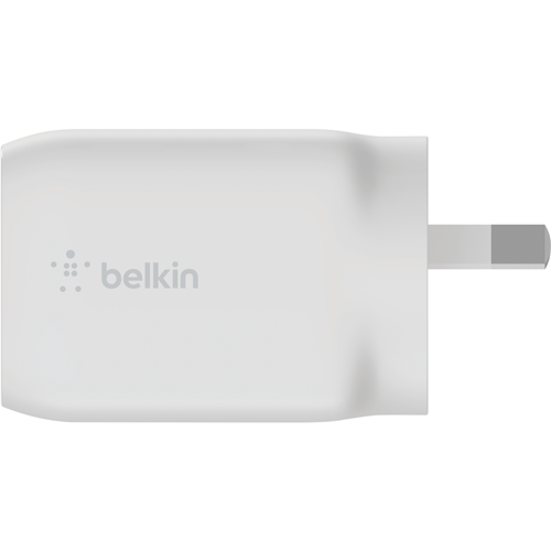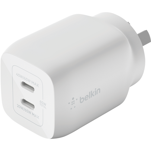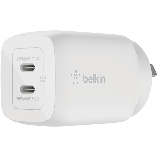 Power up your devices faster than ever with the Belkin Dual USB-C GaN Wall Charger with PPS 65W. This innovative charger packs serious power into a compact lightweight body letting you juice up your phone tablet and laptop without taking up excess space in your bag or on your desk. The dual USB-C ports equipped with gallium nitride (GaN) technology enable incredibly fast charging speeds up to 65W allowing compatible devices to reach 50% battery in as little as 30 minutes. Measuring just 40.8mm high by 102.1mm wide by 13.3mm deep and weighing a mere 160 grams this charger is perfect for your on-the-go lifestyle. With a durable design and 24 month warranty you can trust this charger to quickly and reliably power your devices anytime anywhere. The manufacturer's part number for this product is WCH013AUWH. Discover the convenience of rapid charging with the Belkin Dual USB-C GaN Wall Charger with PPS 65W.