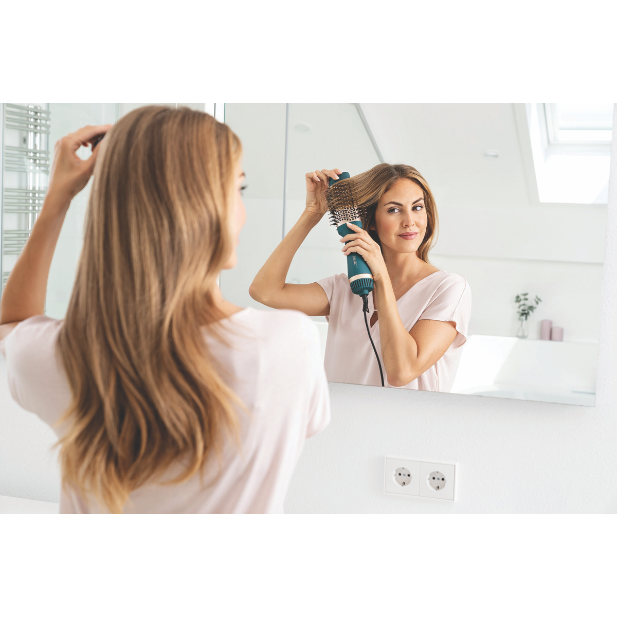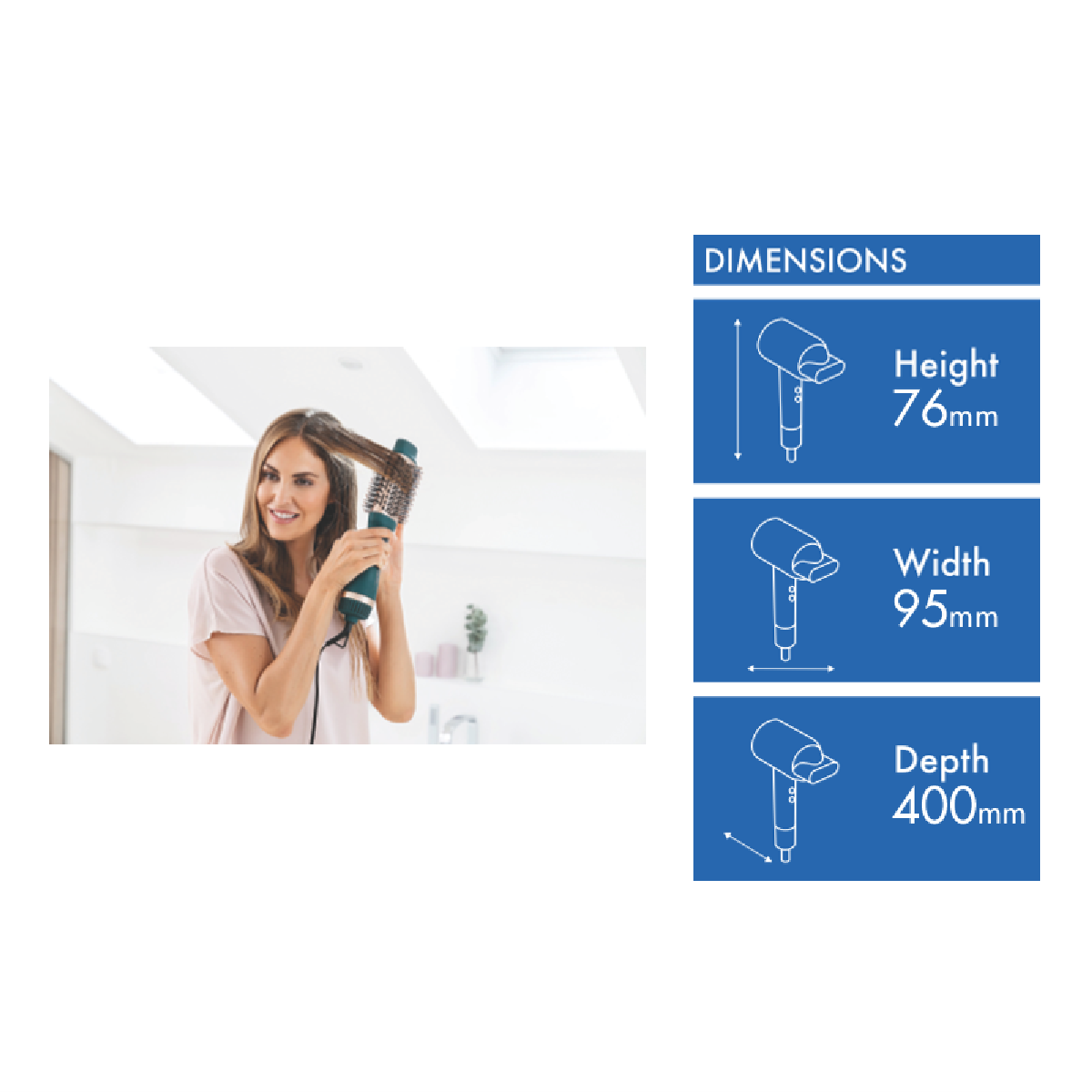 Transform your hair styling routine with the Beurer 2 In 1 Volumising Hair Dryer Brush. This innovative German-engineered hair styler combines the power of a hair dryer with the volume and shine of a round brush for salon-worthy locks in minutes. With 1000 watts of drying power across two heat settings and a cold air function it quickly dries hair while the ionic conditioning and keratin & ceramic coating leaves hair frizz-free and silky smooth. The ergonomic design with anti-slip handle provides control and ease of use when creating bouncy curls or a sleek straight style. At 400mm in length and weighing just 0.475kg it is lightweight and portable. The practical hanging eyelet offers convenient storage making this hair styler ideal for use at home or on the go. With a 3 year warranty from Beurer this hair dryer brush delivers versatile styling and enhanced volume and shine every day. The manufacturer's part number for this product is HC45OCEAN. Achieve salon-quality hair with ease using the Beurer 2 In 1 Volumising Hair Dryer Brush.