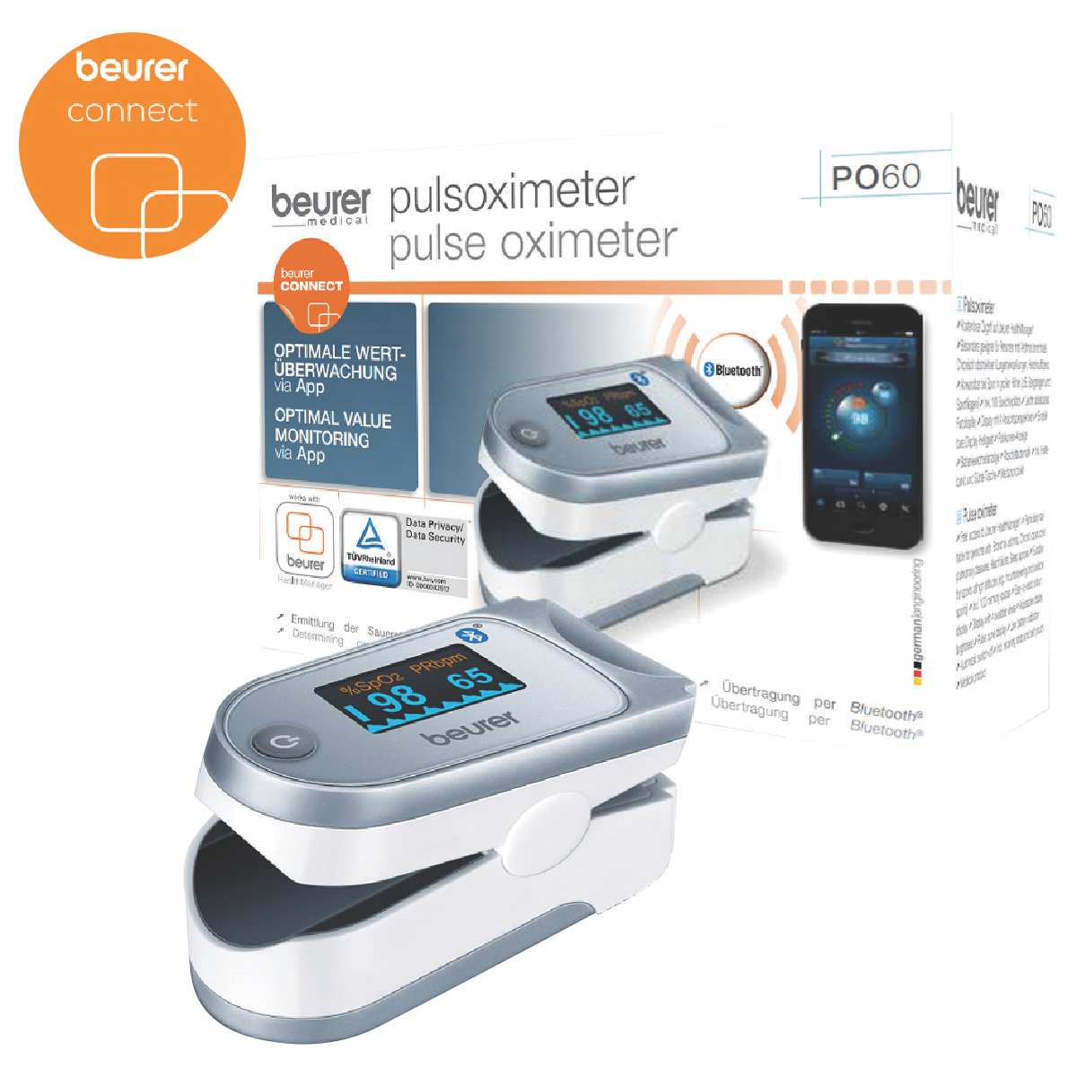 Stay on top of your health with the Beurer Bluetooth Pulse Oximeter. This innovative pulse oximeter monitors your pulse rate and oxygen saturation levels delivering key health insights through its easy-to-read color display. With four information screens to toggle through you'll have all the details you need in an instant. Simply place your finger inside the sensor and let the pulse oximeter do the rest. It uses a beam of light to detect changes in the color of your blood alerting you to any concerning fluctuations in pulse or oxygen. The pulse oximeter's Bluetooth connectivity takes health tracking to the next level. Pair it with the Beurer HealthManager app and gain access to in-depth analysis and data history. This gives you greater awareness over your wellbeing and empowers you to make positive lifestyle changes. Lightweight portable and battery powered the pulse oximeter is ideal for on-the-go monitoring. Slip it into the included belt pouch and wear it around your neck or wrist for easy discreet use throughout the day. With innovative features in a compact body the Beurer Bluetooth Pulse Oximeter removes the guesswork from health monitoring. Make every beat count with the help of this advanced oximeter. The manufacturer's part number for this product is PO60. Check your pulse and oxygen levels consistently to gain greater insight into your overall wellbeing.