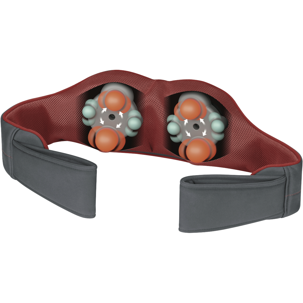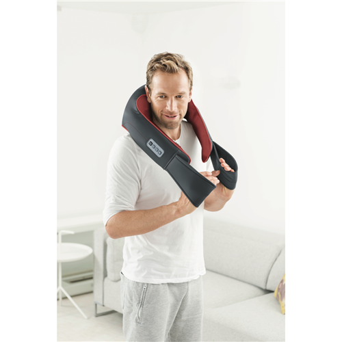 Treat yourself to a soothing massage in the comfort of your own home with the Beurer Deluxe 3D Shiatsu Back and Neck Massager. This belt-style massager uses 8 rotating shiatsu massage heads to deliver a deep kneading massage that will help melt away tension in your neck shoulders and back. The clockwise and anti-clockwise rotation allows you to customize the massage to target tight spots while the 3 intensity levels let you adjust the pressure to your liking. Turn on the heat function to enhance relaxation even further. The faux leather surface provides a smooth comfortable feel against your skin during use. This massager auto shuts off after 15 minutes for added safety. With a lightweight compact design and included adapter you can use this massager anywhere. Give your body the tension-relieving care it deserves with the Beurer Deluxe 3D Shiatsu Back and Neck Massager. The manufacturer's part number for this product is MG151. Relax and rejuvenate with this shiatsu massager today.
