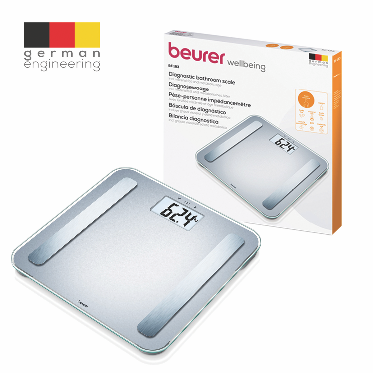 Keep close track of your fitness goals with the Beurer Digital Glass Body Fat Scale. This sleek bathroom scale provides comprehensive body composition measurements to help you monitor your health and fitness. The extra large safety glass platform comfortably accommodates feet of all sizes. Store profiles for up to 8 users to track progress over time. Get precise readings for body weight body fat body water muscle mass ratio bone mass and calorie consumption. The high performance sensors deliver superb accuracy within 0.1% for body fat body water and muscle ratio. Body weight and bone mass are measured precisely within 100g. The slim modern profile blends into any bathroom décor. View your measurements clearly on the bright easy-to-read display. All data is sent to your smart phone for tracking via the free Beurer HealthManager app and Bluetooth connection. Feel confident knowing your stats are safe with automatic user recognition each time you step on the scale. Enjoy the reassurance of Beurer's 5 year warranty. Monitor your fitness and stay motivated to reach your goals with the Beurer Digital Glass Body Fat Scale. BF183 is the manufacturer's part number for this product.