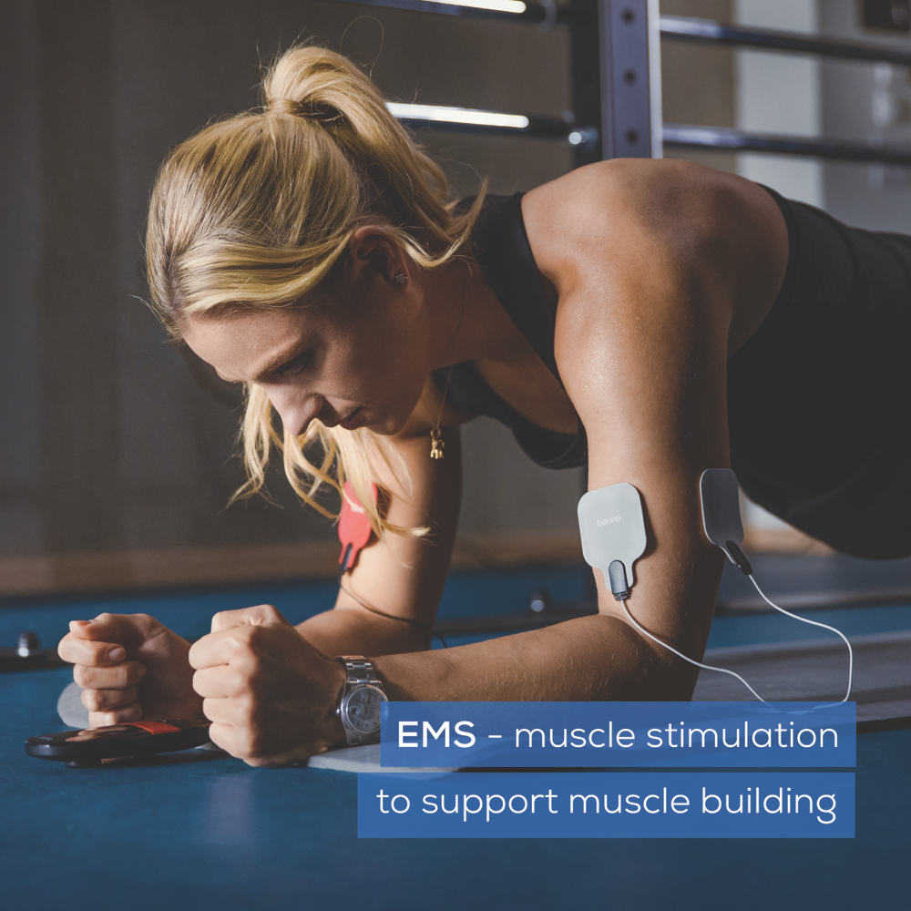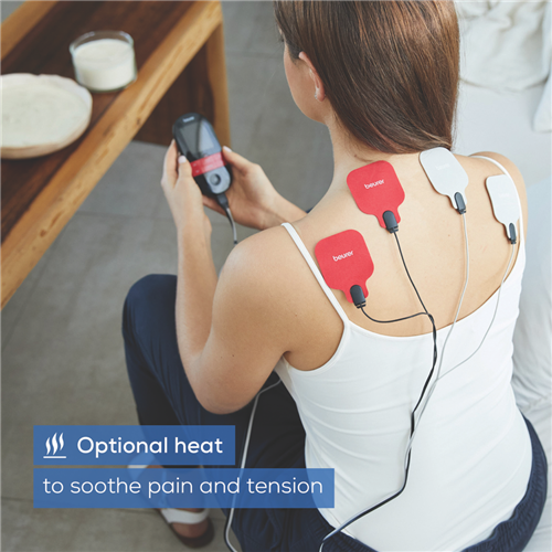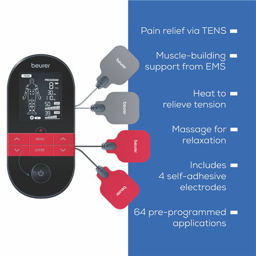 The Beurer EM59 is a digital TENS/EMS device with a heat function offering pain therapy muscle stimulation massage and heat treatment. It features 2 separately adjustable channels 64 pre-programmed applications and 6 customisable programs. The device has 2 heat levels (low at 41°C and high at 43°C) and allows for 3 usage options: TENS/EMS + heat TENS only or heat only.