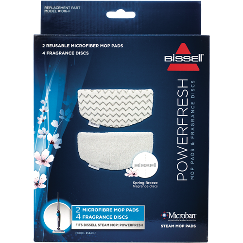 Breathe new life into your Bissell Powerfresh Steam Mop with these replacement steam mop pads. Compatible with the Powerfresh Steam Mop these replacement pads feature two soft microfiber mop heads that gently lift away dirt and grime from hard floors. The absorbent microfiber material traps dust and picks up debris while the scrubby strip gives your floors an extra clean boost. Simply attach the washable reusable pads to refresh your mop with brand new cleaning power. With two pads per pack you can swap out dirty pads for clean ones and keep cleaning continuously. Give your floors a sparkling clean finish without harmful chemicals using hot steam and Powerfresh replacement pads. Keep your steam mop performing like new while saving money on replacement pads. Bissell's exclusive design offers easy and convenient pad changes when it's time to refresh. For best cleaning performance replace your steam mop pads every 3-6 months. The manufacturer's part number for this product is 1016F. Pick up this two-pack of Powerfresh steam mop pads to renew your Bissell for spotless sanitized floors.