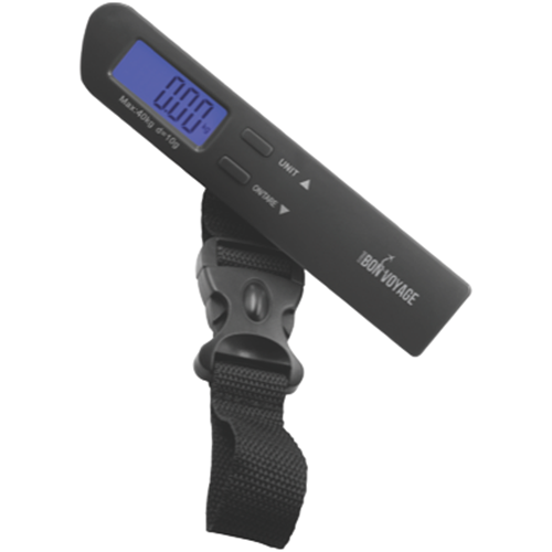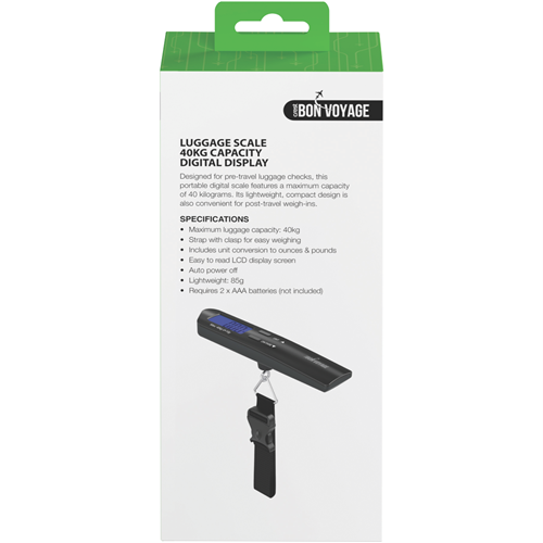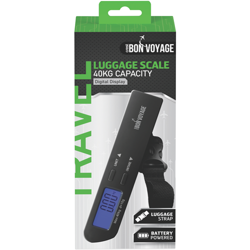 Bring the thrill of a new journey with you whenever you travel with the sleek portable Bon Voyage Luggage Scale. Weighing your bags is easy with the large LCD screen that clearly displays weight up to 40kg ensuring you never exceed airline weight restrictions. The compact design with handy strap and clasp makes weighing luggage simple in the blink of an eye. With the Bon Voyage scale avoid excess baggage fees and focus on making memories. This must-have travel accessory runs on two AAA batteries (not included) and comes with a 1 year manufacturer's warranty.