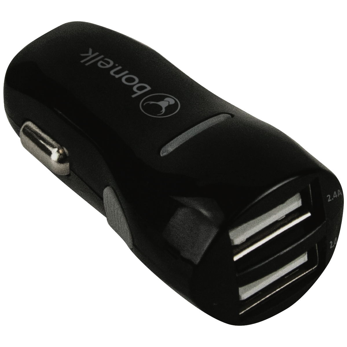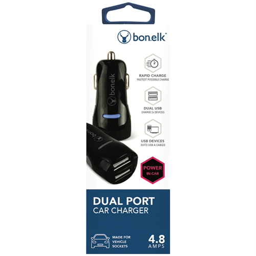 Take charge of your in-car technology with the Bonelk Dual Port 4.8A USB Car Charger. This must-have car accessory powers up your devices faster than ever before with two high-speed USB ports delivering a max output of 4.8A to rapidly charge two gadgets at once. The slim compact design allows for easy handling and storage in your vehicle's cup holders or console. Built tough with premium circuitry it's engineered to protect your devices against overload and overheating. The dual USB ports are universally compatible with all USB-powered phones tablets GPS units and more. With superior performance and safety keep your gadgets powered for navigation music and calls on the move. The Bonelk Dual Port Car Charger makes charging simple delivering the optimized power output you need to stay connected on the road. The manufacturer's part number for this product is ELK-22511-R.