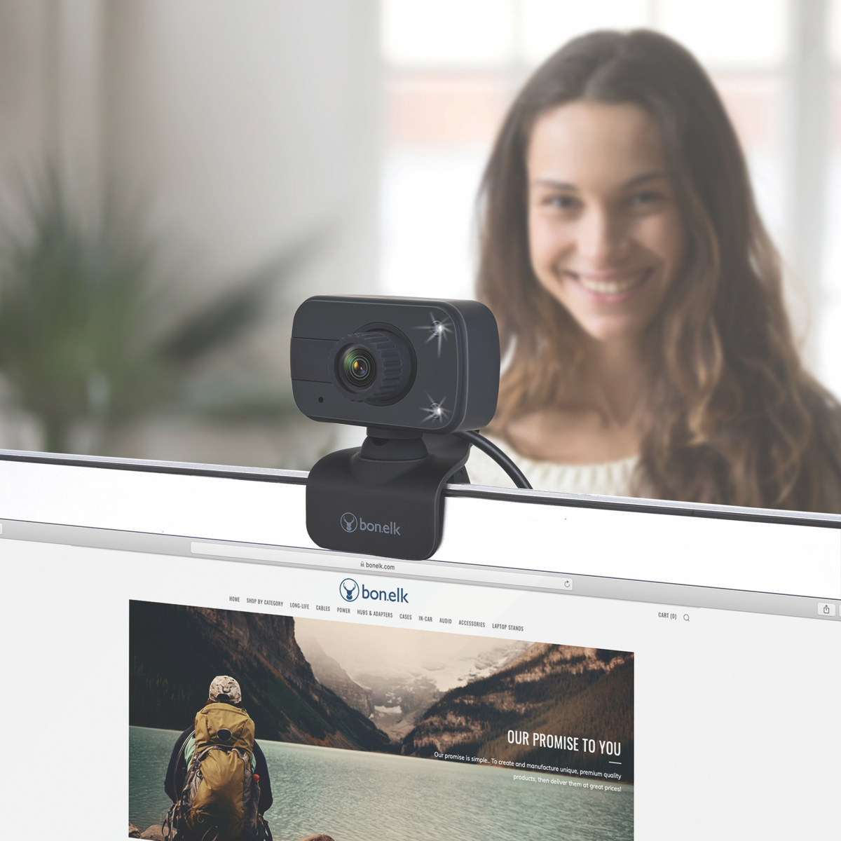 This 1080p USB webcam from Bonelk delivers high-definition video and crisp audio for seamless video calls. With a convenient clip-on design and built-in LED lights this webcam can be easily attached to your monitor or laptop to capture well-lit footage in any setting. Connect via USB 2.0 and enjoy fluid 30fps video in full HD 1920x1080 resolution. The auto-adjusting camera with widescreen viewing angles ensures you stay perfectly framed on video chats. An integrated microphone picks up your voice clearly while reducing background noise. Compatible across Windows Mac and Android operating systems this plug-and-play webcam works right out of the box. So whether you're video conferencing for work or keeping in touch with loved ones this Bonelk webcam enhances connectivity. With handy features packed into a portable form factor it's a versatile imaging solution for home office and travel use. The manufacturer's part number for this product is ELK-63022-R. Check out this 1080p webcam today to upgrade your video calling experience.