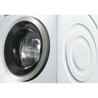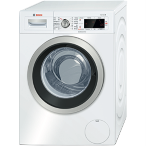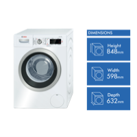 This white Bosch front load washing machine has a high 5 star WELS water rating and a 4 star energy rating for bill savings and the capacity to wash 8kg of dry laundry for each load so you can save money by running fewer loads of laundry for your 3 or 4 people. It features 14 types of washing programs so you can optimise the setting for each wash. Wring out all the moisture from your clothes with the white Bosch WAW28460AU's high 1400 rpm maximum spin speed. It has a delayed start setting. This white front load washing machine is 848mm high 598mm wide and 632mm deep so measure your laundry carefully to ensure it will fit remembering to leave at least 2.5 cm between the washer and the wall and enough space above for a dryer if you want to wall mount it above the washer.