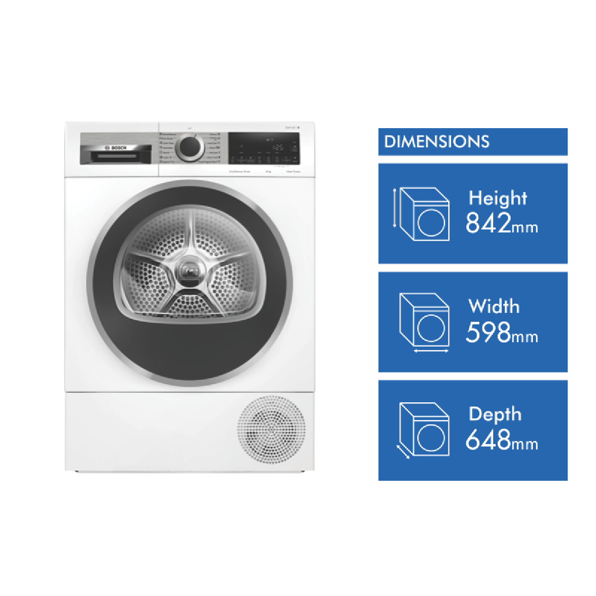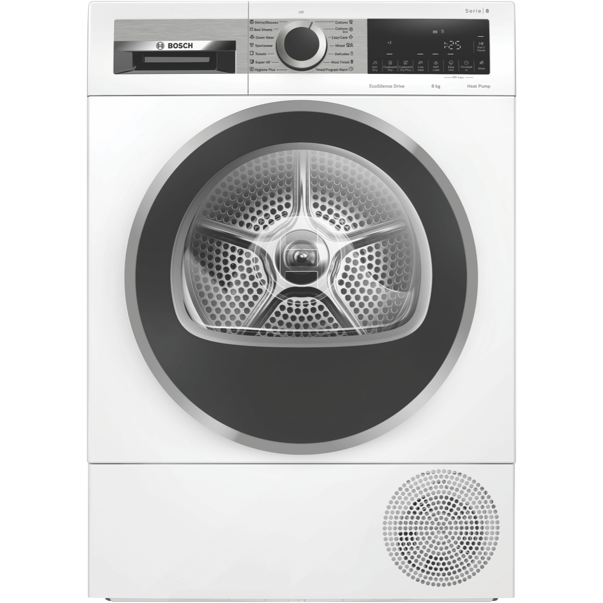 Make short work of laundry with the Bosch 8kg Heat Pump Dryer. With its large 8kg capacity this clothes dryer lets you dry more in one load saving you time spent doing laundry. The innovative heat pump technology gently dries clothes at lower temperatures protecting fabrics while achieving an impressive 9 star energy rating for efficiency. Select from 10 drying programs like Cotton Easy Care and Delicates to customize cycles to your wardrobe. The special Bed Linen program utilizes the reversible drum action to thoroughly dry bulky linens. ActiveAir technology circulates air evenly for consistent drying while the SelfCleaning Condenser prevents lint buildup inside the dryer. Load your clothes select your preferred dryness level and let the intelligent sensor take care of the rest for optimized results. With handy features like delay start half load and auto dry this dryer takes the guesswork out of laundry day. The sleek white finish and LED display add style and modern appeal to any laundry room. Backed by Bosch's 2 year warranty the Bosch 8kg Heat Pump Dryer makes easy work of laundry so you can spend more time doing the things you love. The manufacturer's part number for this product is WQG235D8AU. Learn more about the benefits this innovative clothes dryer can provide your household.
