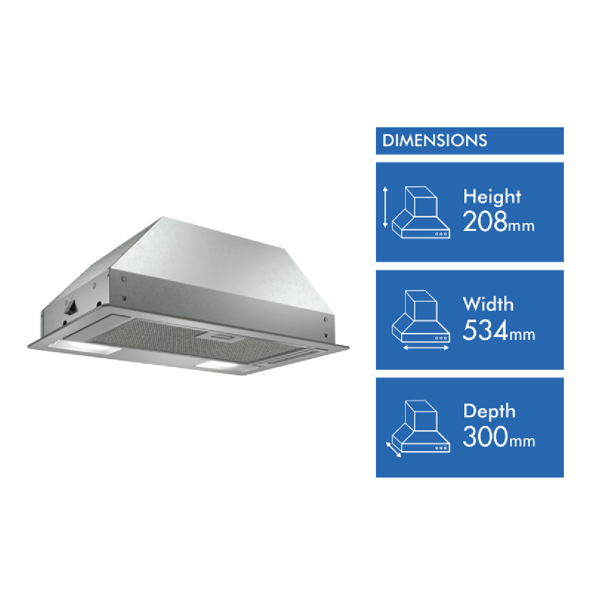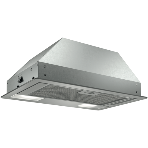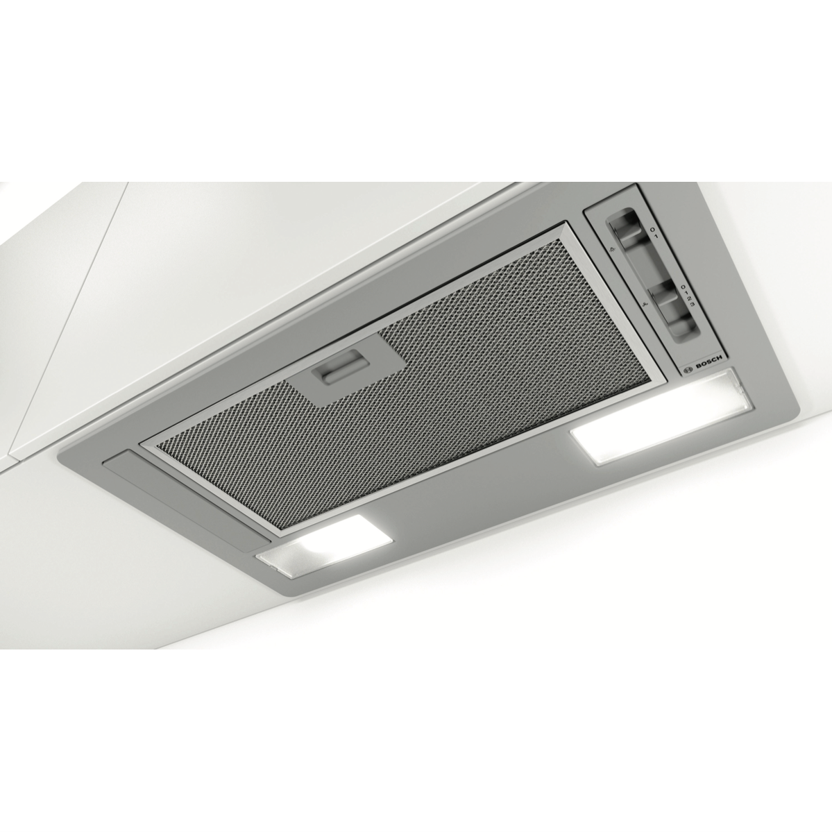 Add a touch of modern style to your kitchen with the Bosch 53cm Integrated Rangehood. This undermount rangehood boasts a sleek stainless steel and grey fascia that will complement contemporary decor. With an impressive 420 cubic metres per hour extraction capacity and 3 fan speeds this rangehood will efficiently remove steam grease and odours while you cook. The two LED lights illuminate your cooktop for optimal visibility. Features like the sliding switch controls one-way flap and integrated motor make operation seamless. You'll appreciate the quiet 68 decibel noise level that won't disrupt conversations. Ducted or recirculated options provide flexible installation.With a width of 534mm height of 208mm and depth of 300mm this rangehood fits neatly under your cabinetry. The durable stainless steel finish is easy to wipe clean and will stand the test of time. It comes with a 2 year manufacturer's warranty for peace of mind.Add modern style and efficient ventilation to your kitchen with the Bosch 53cm Integrated Rangehood. This rangehood will keep your kitchen fresh while complementing your decor. The manufacturer's part number for this product is DLN54AA70A.