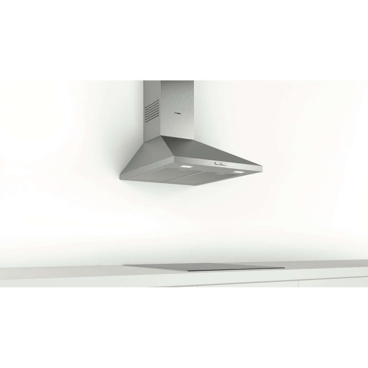 Bring sleek modern style to your kitchen with the Bosch 60cm Wall Canopy Rangehood. With its pyramid design and stainless steel finish this rangehood makes a striking statement. But it's more than just stylish - the Bosch rangehood is engineered for powerful performance. Twin motors generate an extraction capacity of 570 cubic metres per hour to thoroughly eliminate cooking odours smoke and vapours. The three fan speeds and push button controls let you adjust the airflow to suit your needs. Dual LED lights illuminate your cooktop brilliantly. Filters are easy to remove and pop in the dishwasher for simple cleaning. At 600mm wide this rangehood fits neatly above 60cm cooktops or stoves. With a height of 975mm and depth of 500mm the canopy has ample coverage to capture steam and aromas. Bosch includes their two year warranty for added peace of mind. The manufacturer's part number for this product is DWP66BC50A. Bring home the Bosch Wall Canopy Rangehood for a fusion of form and function in your kitchen today.