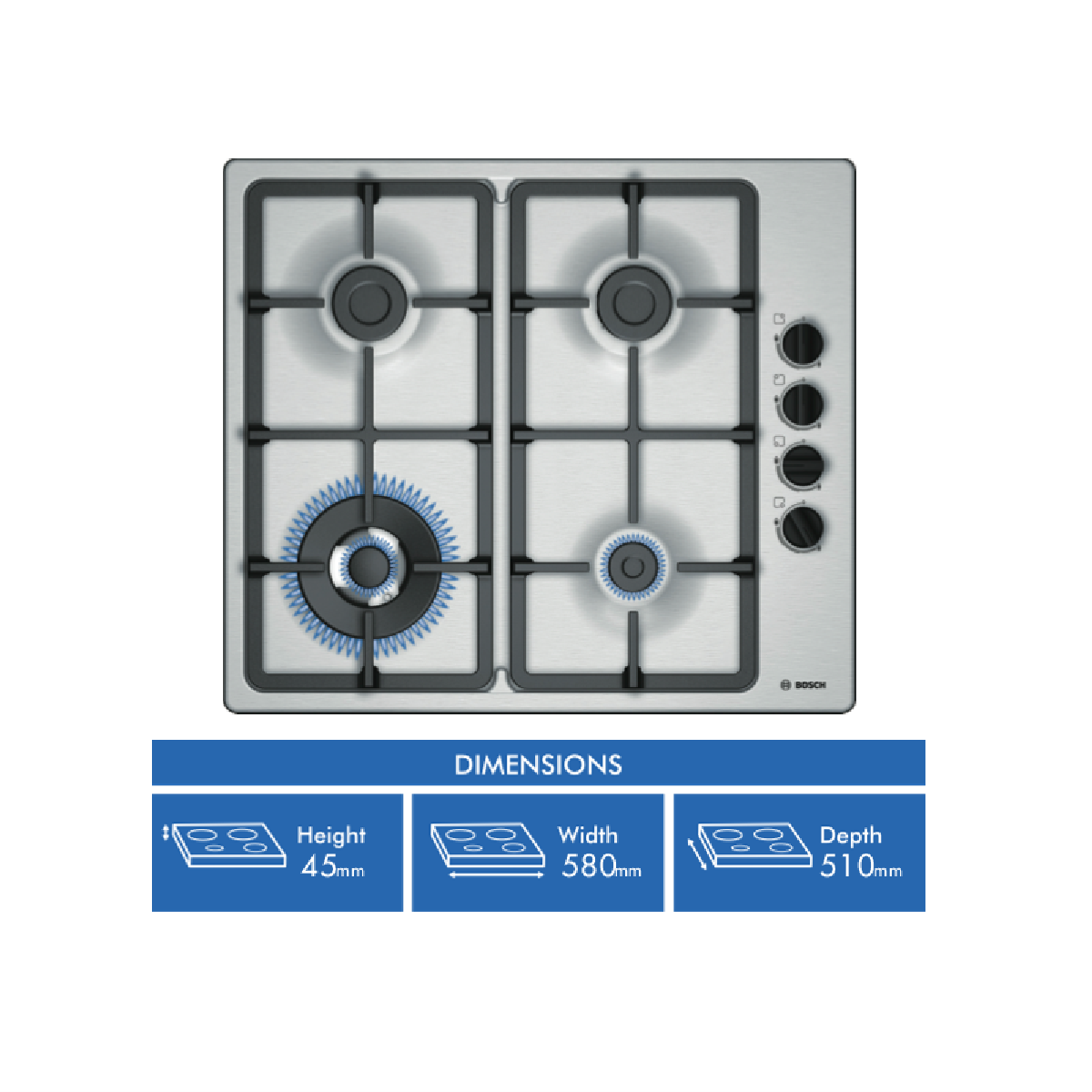 Transform your kitchen into a chef's paradise with the Bosch 60cm Gas Cooktop. This stainless steel beauty brings together impeccable German engineering and modern design to help you whip up delicious meals for the whole family. With four burners including a powerful wok burner you'll have the versatility to boil sear stir fry or simmer multiple dishes at once. The continuous cast iron pan support provides a sturdy and stable cooking surface while the flame failure safety device offers peace of mind. With intuitive knob controls and included natural gas nozzles this cooktop makes cooking a breeze. Bring out your inner master chef with features like 2 standard burners 1 economy burner and 1 high-powered wok burner to unleash your culinary creativity. This cooktop's sleek look and 580mm width will complement any modern kitchen. For convenient cleaning the trivets are crafted from durable cast iron. Ignite your passion for cooking with this must-have appliance from Bosch. The manufacturer's part number for this product is PBH6B5B90A. Bring home this cooktop today for tasty meals for years to come.