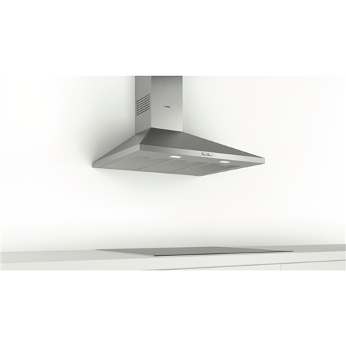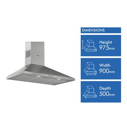 Revamp your kitchen with the sleek modern Bosch 90cm Wall-Mounted Stainless Steel Series 2 Canopy Rangehood. This powerful twin motor rangehood boasts an impressive 600 cubic meters per hour extraction capacity to effectively eliminate cooking odors and steam. The contemporary stainless steel finish and LED lighting add style and illumination to your cooking space. With intuitive push button controls and 3 fan speeds you can easily adjust airflow. The rangehood filters are crafted from durable aluminium and are dishwasher safe for simple cleaning. One-way flaps prevent outside air from entering the kitchen. At just 51-69 decibels this rangehood operates quietly. Transform your cooking experience with the Bosch 90cm Canopy Rangehood. The manufacturer's part number for this product is DWP96BC50A. Discover how this rangehood can enhance your kitchen today.