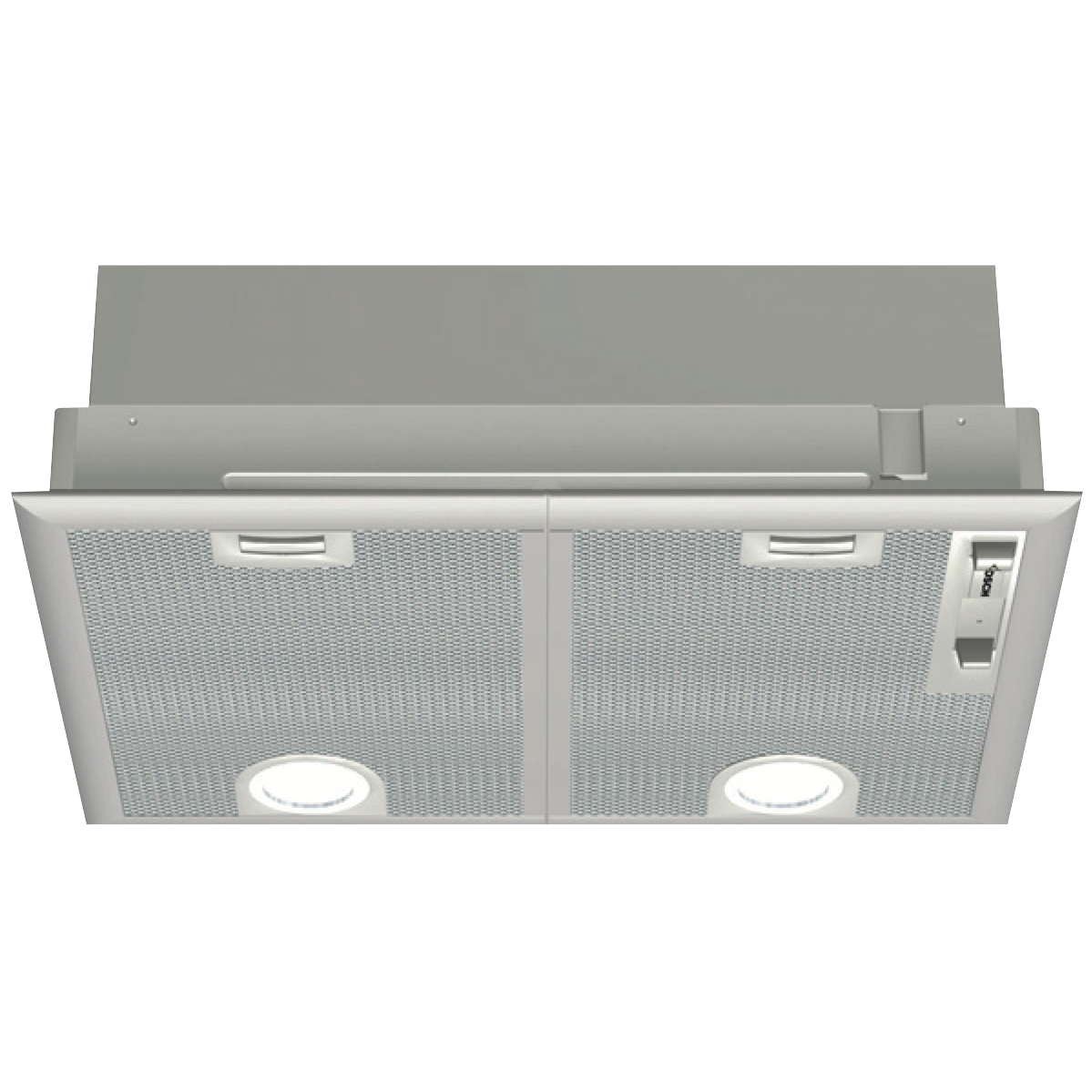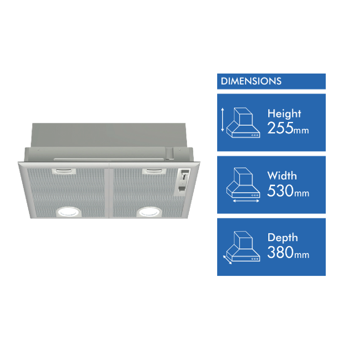 Eliminate kitchen smoke and fumes with the powerful performance of the Bosch Series 4 53cm Undermount Rangehood. This sleek silver metallic hood makes short work of steam grease and lingering odors thanks to 650 cubic meters per hour extraction capacity and twin motors. With three fan speeds plus an intensive setting you can clear the air in moments. The two aluminum grease filters are dishwasher-safe for simple cleaning. Use the convenient slider switch and LED indicator lights to control settings. At 530mm wide 255mm high and 380mm deep this rangehood mounts under your cabinetry to maintain your kitchen's streamlined aesthetic. Bosch engineering ensures smooth quiet operation from 41 to 59 decibels. Ducted or recirculating this rangehood optimizes air quality. Enjoy the halogen lighting as you cook. Backed by a two year manufacturer's warranty the Bosch Series 4 Undermount Rangehood keeps your kitchen crisp and fresh. The manufacturer's part number for this product is DHL555BAU. Transform your cooking space with an advanced air purification system.
