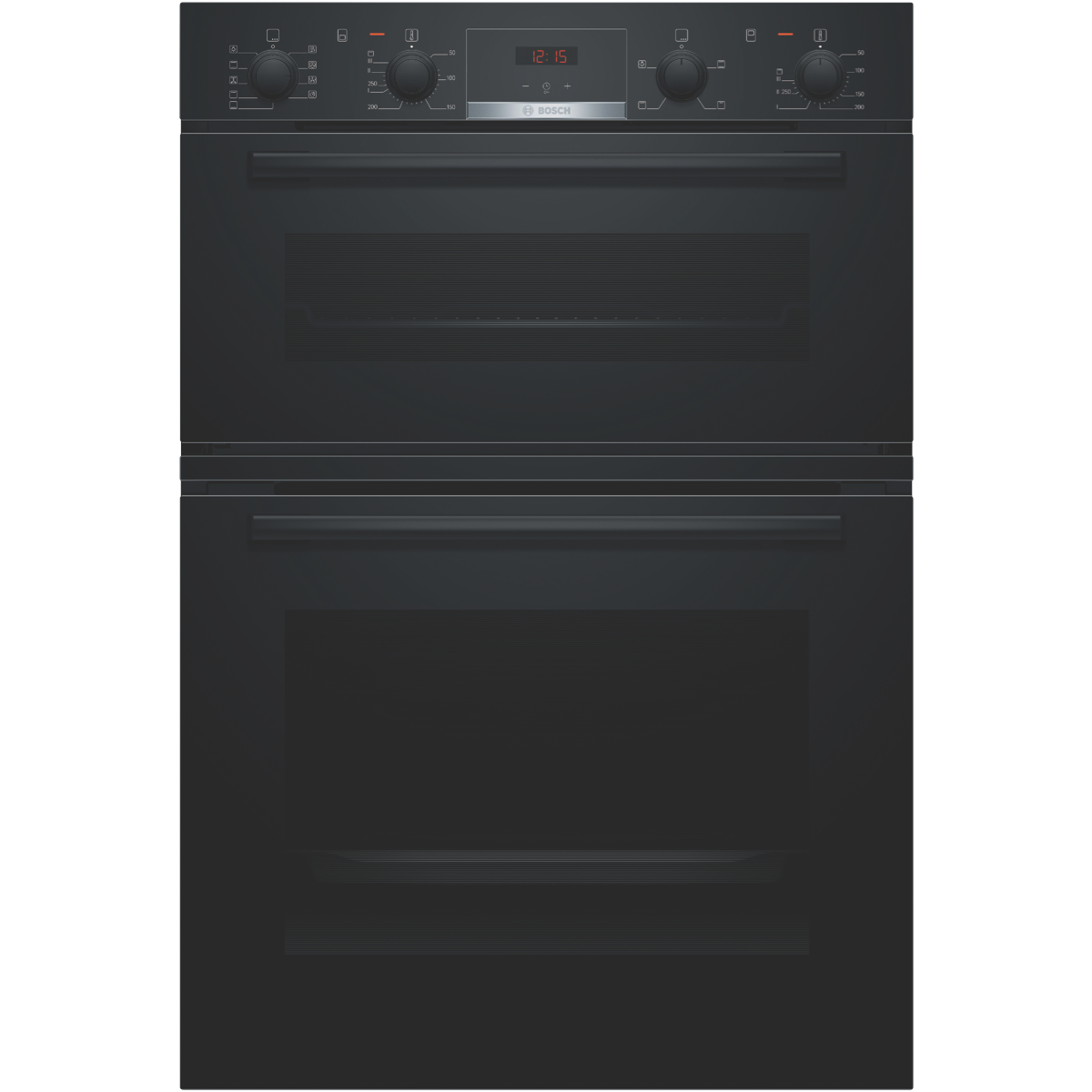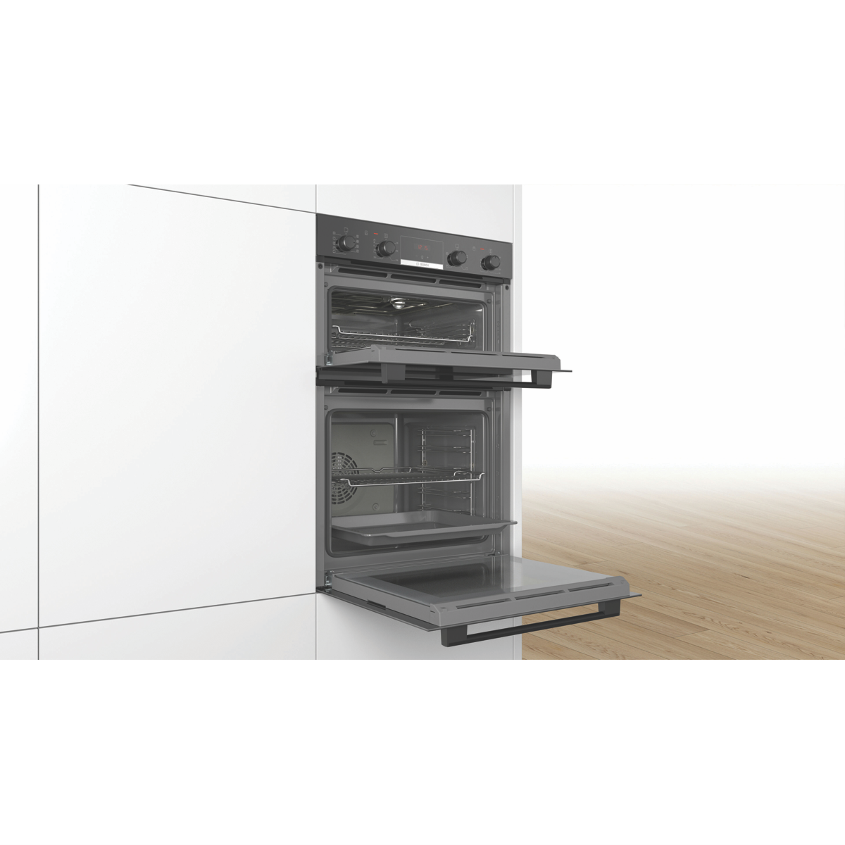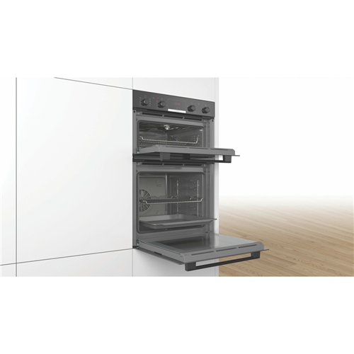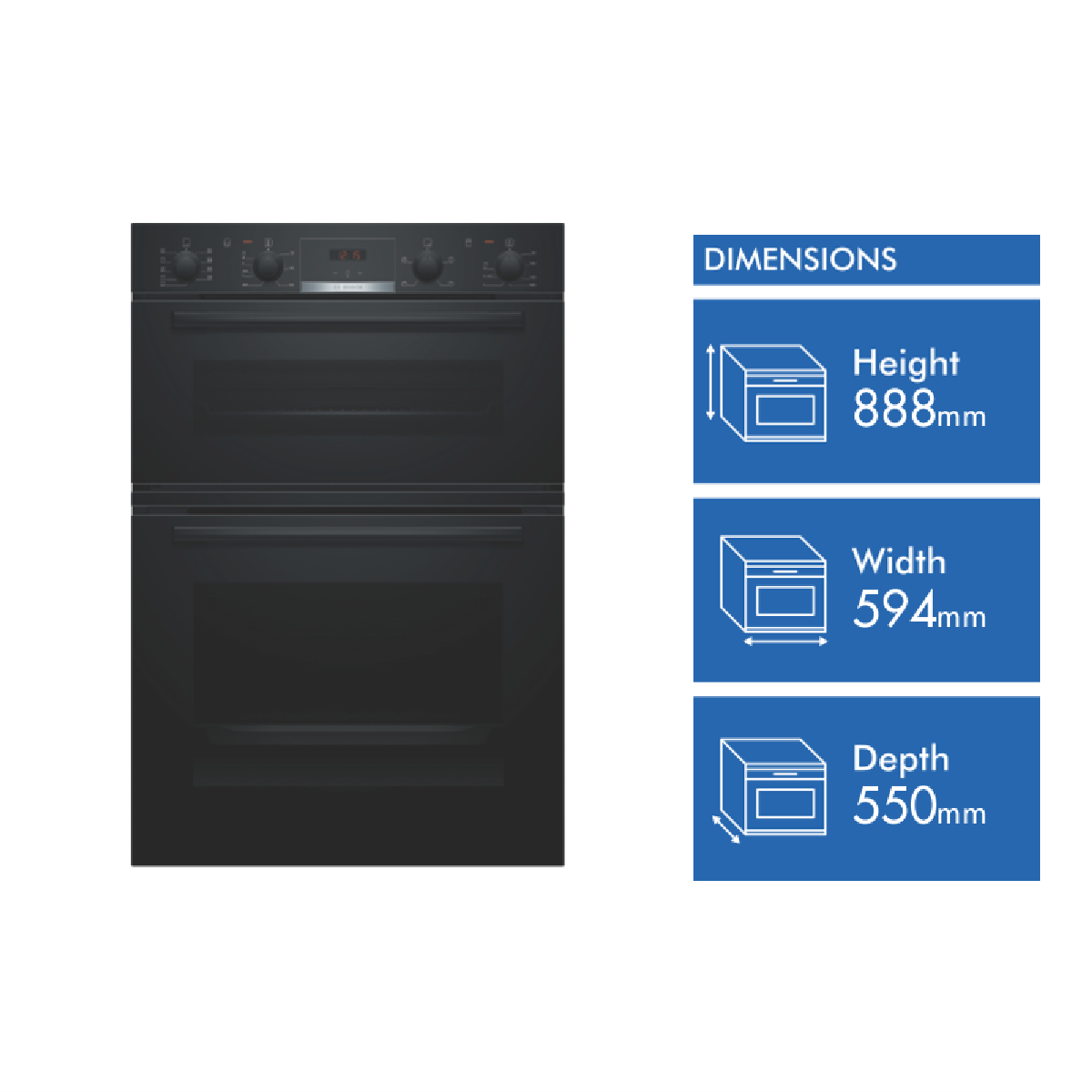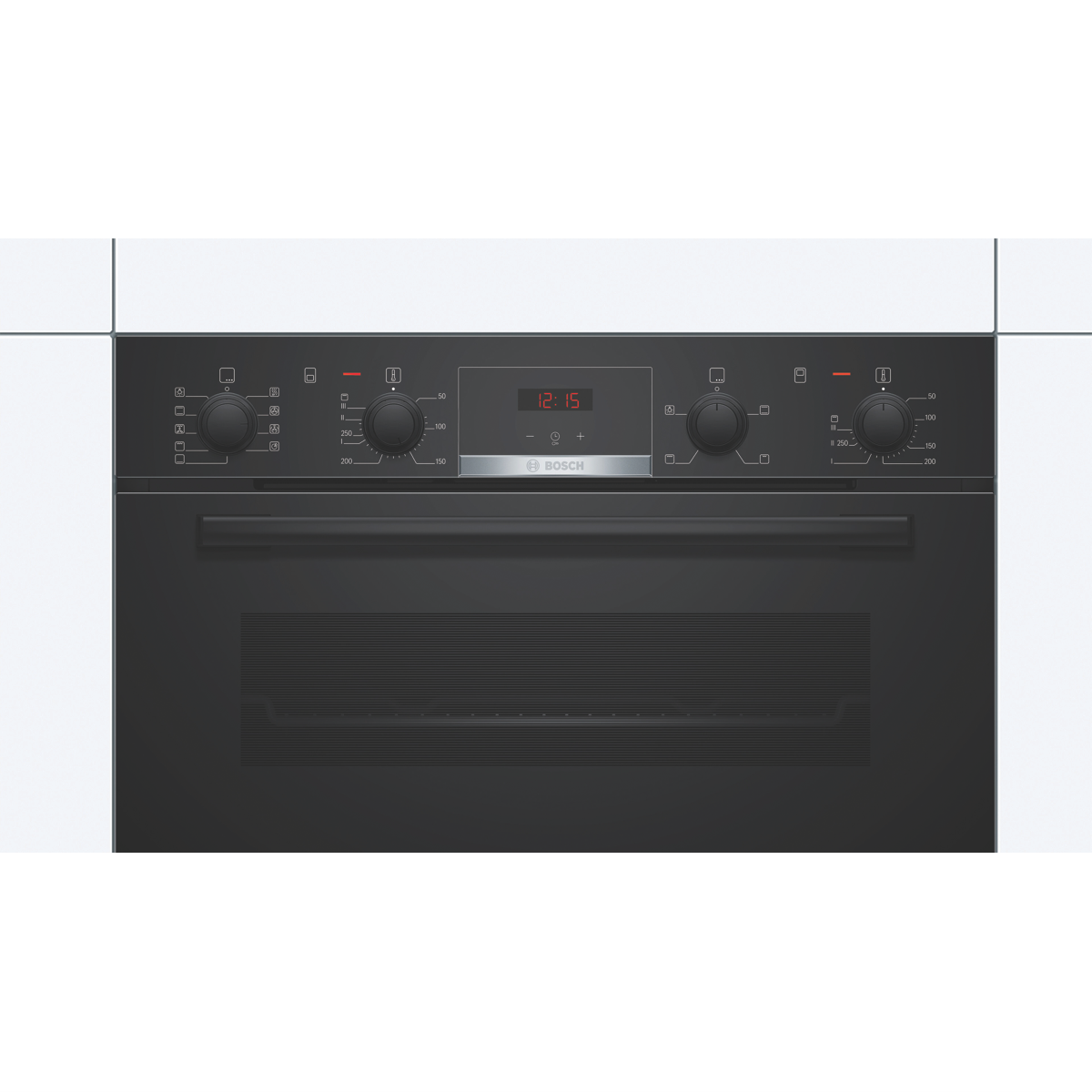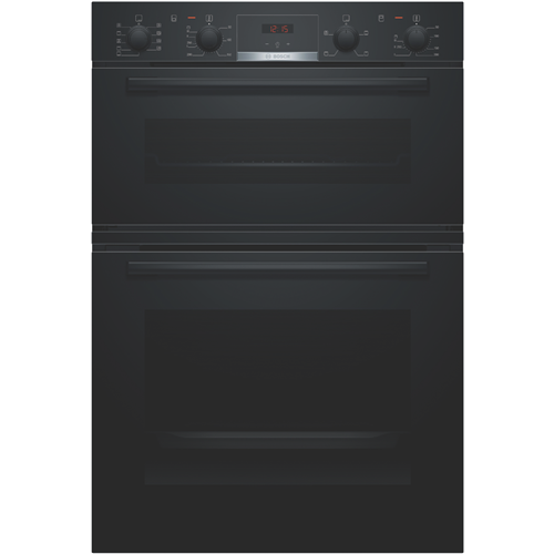 Bring a modern touch to your kitchen with the sleek built-in Bosch 60cm Serie 4 Double Oven in stylish black. This versatile electric double oven simplifies cooking and baking with generous 71L and 34L capacities letting you prepare family-sized meals or bake batches of cookies with ease. The main cavity features seven heating methods like 3D Hotair and pizza setting to suit different dishes while the compact upper oven provides top bottom and grill heating for smaller portions. Dual oven cavities reduce waiting times between dishes and the electronic timer programs end times so your meal is ready when you are. With a temperature range from 50°C to 275°C five shelf levels and full glass inner door operation is flexible and visibility excellent. Safety comes first with a child lock function on the main oven. Retractable control knobs rapid heating and a maximum door temperature of just 40°C add further convenience. Rated at a low-emission A for energy efficiency this Bosch double oven helps you cook responsibly. The manufacturer's part number for this product is MBA534BB0A. For a modern and efficient way to cook family meals look no further than the Bosch 60cm Serie 4 Double Oven.