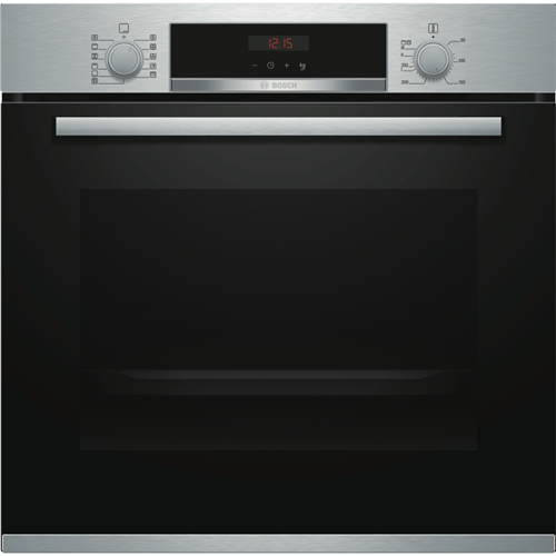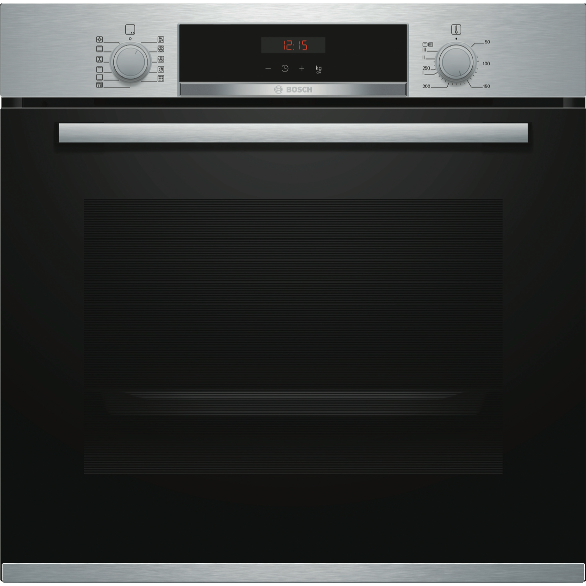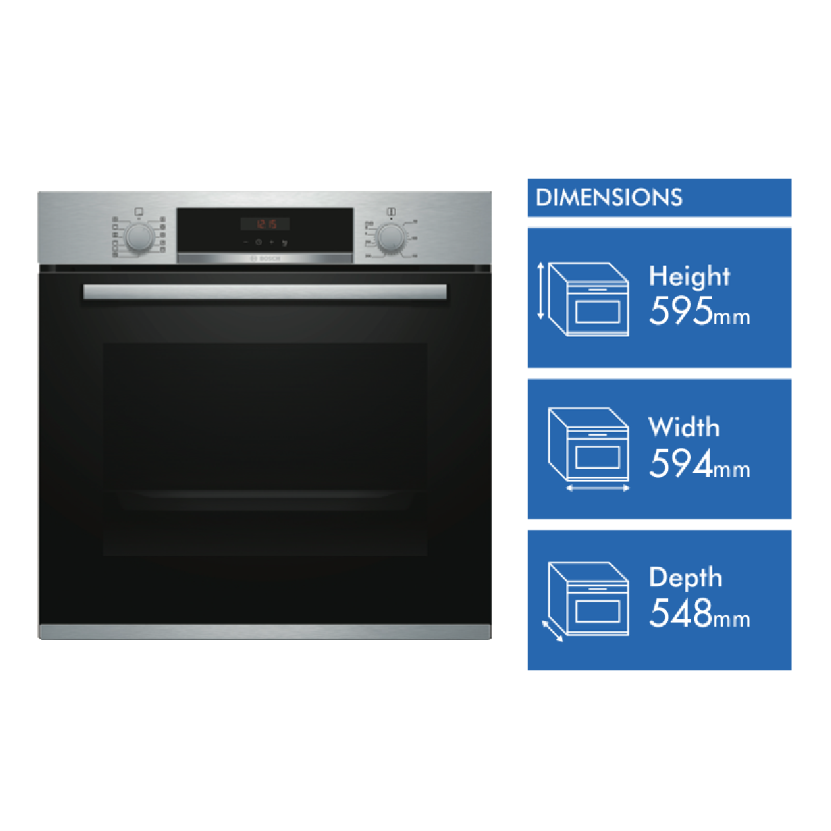 The Bosch 60cm Pyrolytic Oven HBA574BS0A is an innovative electric oven that makes cooking easier and more enjoyable. With its sleek stainless steel and black glass design this visually stunning Series 4 oven will be the centerpiece of your kitchen. The generous 71L capacity accommodates large family meals while the intuitive controls like retractable knobs an electronic timer and child lock provide added convenience. The real magic lies in the 7 versatile oven functions. From the precision of 3D Hot Air to the caramelized crust of Hot Air Grilling you'll achieve perfect results every time. The built-in AutoPilot feature offers 10 pre-set automatic cooking programs taking the guesswork out of everything from roasting to baking. The Quadruple Glazed Cool Touch Door keeps the exterior safe to touch and the SoftClose mechanism ensures smooth quiet closing. With just a touch of a button the 3 stage Pyrolytic Cleaning function incinerates food residue to leave the cavity spotless. An automatic safety switch off provides peace of mind. This 60cm wide oven comes with a 2 year manufacturer's warranty and requires professional installation. The manufacturer's part number for this product is HBA574BS0A. Bring restaurant quality dishes to your home kitchen with the Bosch 60cm Pyrolytic Oven.
