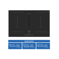 Enhance your kitchen with the sleek modern Bosch 80cm induction cooktop. With its black ceramic glass surface and intuitive touch controls this cooktop combines advanced technology with timeless style. Four induction zones allow for precise temperature control while the two combi zones give you flexibility to accommodate pots and pans of different sizes. The 17 power levels and QuickStart function provide customized cooking and the digital residual heat indicators add an extra layer of safety. Additional highlights include automatic pan recognition power boost and a timer for ultimate convenience. With integrated ventilation featuring 9 fan speeds this cooktop also helps keep your kitchen fresh while cooking. Known for its innovative German engineering Bosch builds this induction cooktop to last with a two-year warranty. Bring high-performance cooking and effortless style to your kitchen with the Bosch 80cm induction cooktop with ventilation. The manufacturer's part number for this product is PVQ811F15E.
