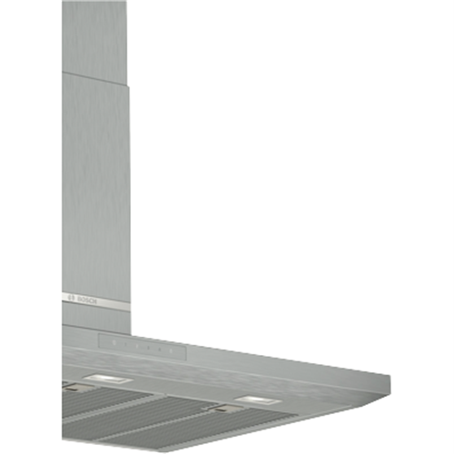 Transform your kitchen with this powerful yet quiet Bosch 90cm stainless steel canopy rangehood. With a sleek modern design this wall-mounted hood will keep your cooking area fresh and clean. Its large size and powerful 697 cubic meters per hour extraction capacity quickly remove steam grease odors and more from the air. The ultra-quiet 45-64 decibel brushless motor lets you cook and converse comfortably. LED lighting illuminates your stove or cooktop while three dishwasher safe stainless steel filters trap grease and are easy to clean. Convenient electronic controls with an LED display let you choose from four fan speeds including an intensive setting for maximum ventilation. Ducted or recirculating options provide flexibility for any home. Create a kitchen oasis with this high-performing and stylish Bosch canopy rangehood. Its 90cm size and robust 697 cubic meter per hour extraction capacity will revolutionize your cooking environment. The manufacturer's part number for this product is DWB97LM50A.