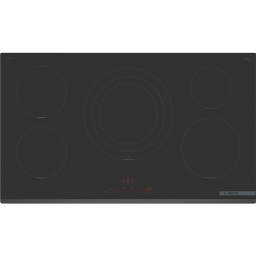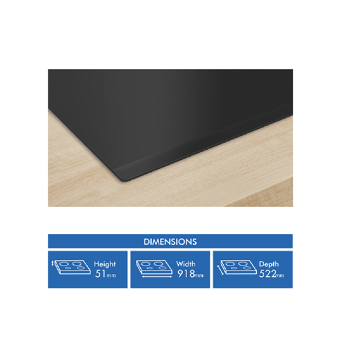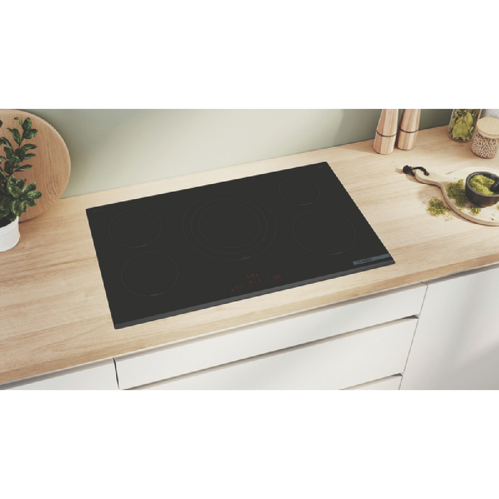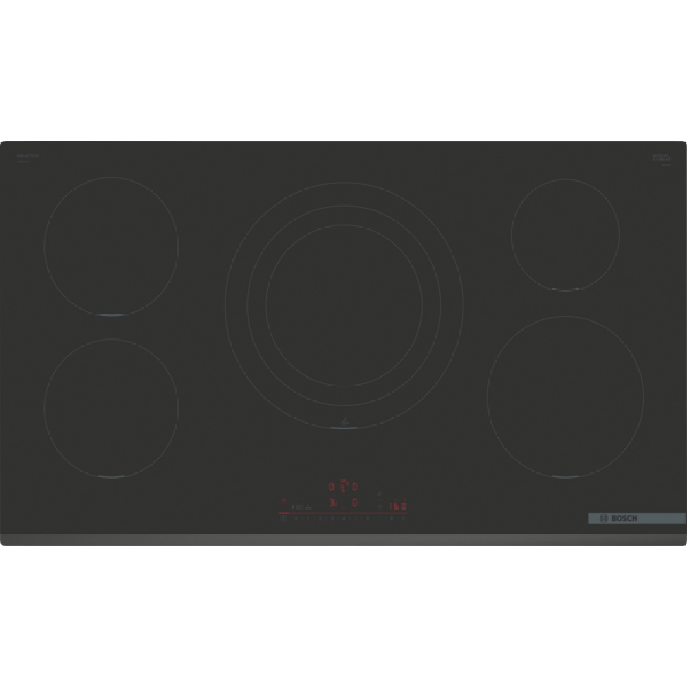 Step up your kitchen with the power and precision of the Bosch Series 6 90cm Induction Cooktop. This sleek black glass cooktop boasts 5 induction cooking zones to accommodate all your cooking needs. The touch controls with 17 power levels allow you to fine-tune heat with ease. Features like PowerBoost ReStart QuickStart and Pause give you complete command over your cooking. With automatic pan recognition this cooktop intelligently detects your cookware. The switch-off timer count-down timer and child lock provide added safety and convenience. At 918mm wide this spacious cooktop has room to cook multiple dishes at once. The durable glass surface simply wipes clean after use. With intelligent DirectSelect and automatic safety switch off Bosch brings the latest induction technology to your kitchen. Backed by Bosch's 2 year warranty this cooktop delivers advanced features you can count on for quicker easier and smarter cooking every day. The manufacturer's part number for this product is PIV931HC1E. Bring home the Bosch Series 6 90cm Induction Cooktop for high-performance cooking.