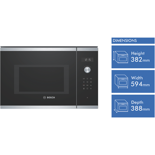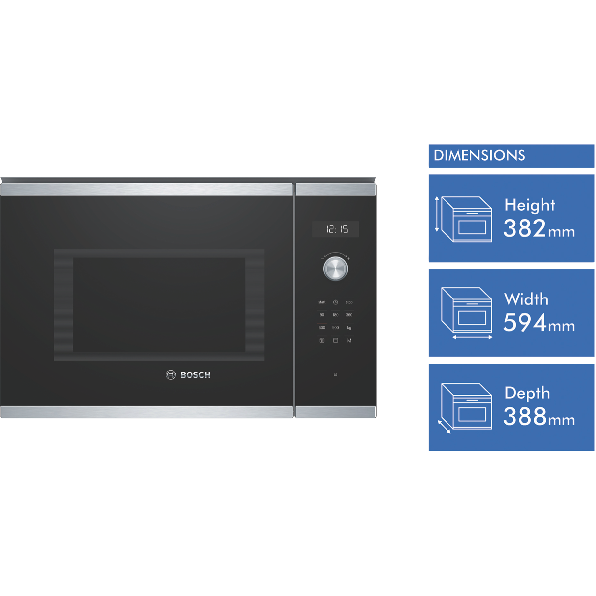 Bring the latest in microwave innovation into your kitchen with the Bosch Series 6 Built-in Microwave Oven BEL554MS0A. This sleek 25L capacity microwave comes equipped with a powerful 900W microwave paired with a 1200W quartz grill providing quick and even cooking for all your family's meals. The touch controls and LED display offer simple programming while the child lock provides extra safety and peace of mind. With a stylish black finish and compact 60cm width this built-in microwave will seamlessly integrate into your kitchen design. It comes packed with features like 8 auto-cook programs 4 defrost settings and a multi-stage cooking function to take the guesswork out of microwave cooking. The automatic safety switch and 2 year manufacturer's warranty give you confidence in this quality appliance. Bring gourmet cooking into your home with the Bosch Series 6 Microwave Oven. The manufacturer's part number for this product is BEL554MS0A. Make your life easier with quick and delicious meals from this innovative built-in microwave.