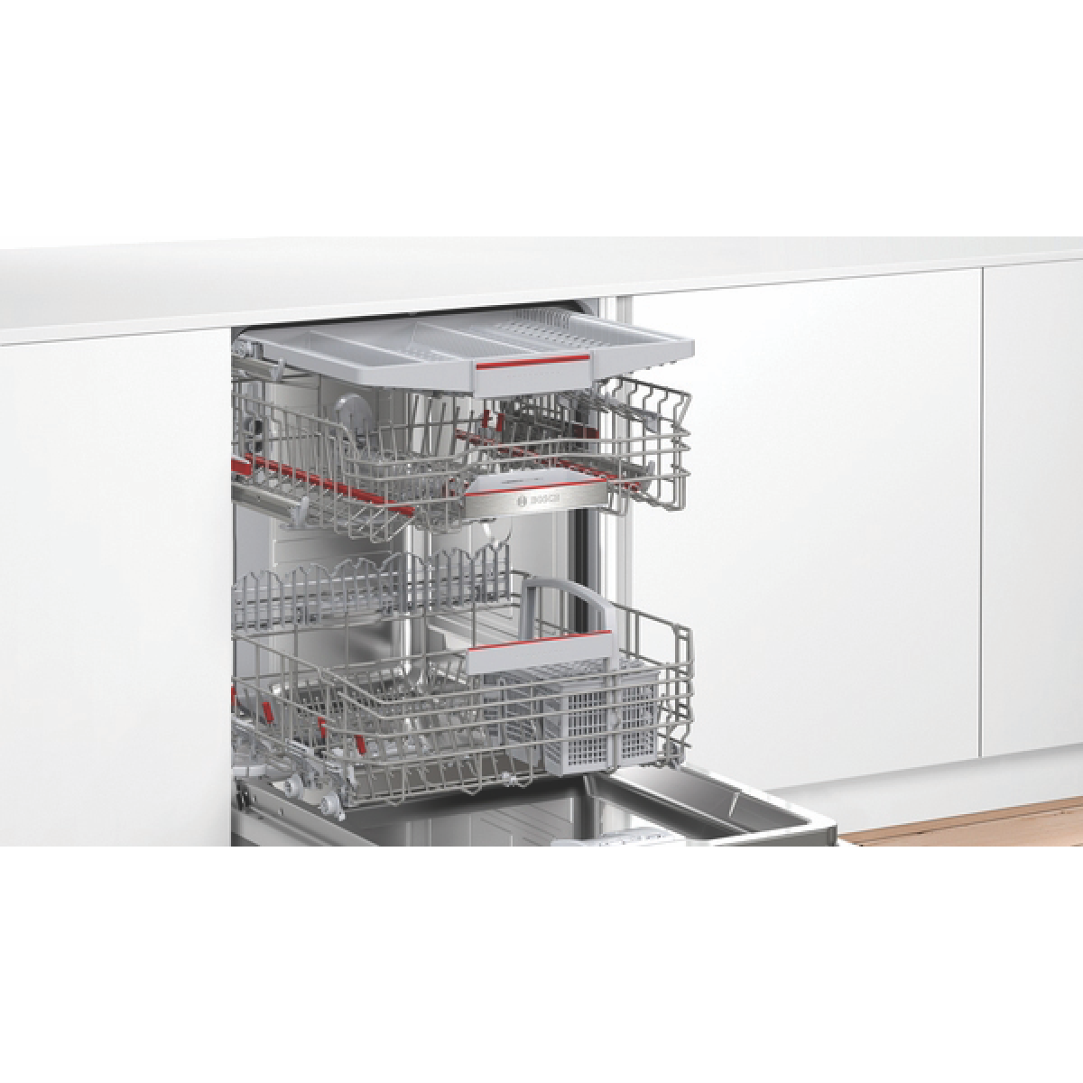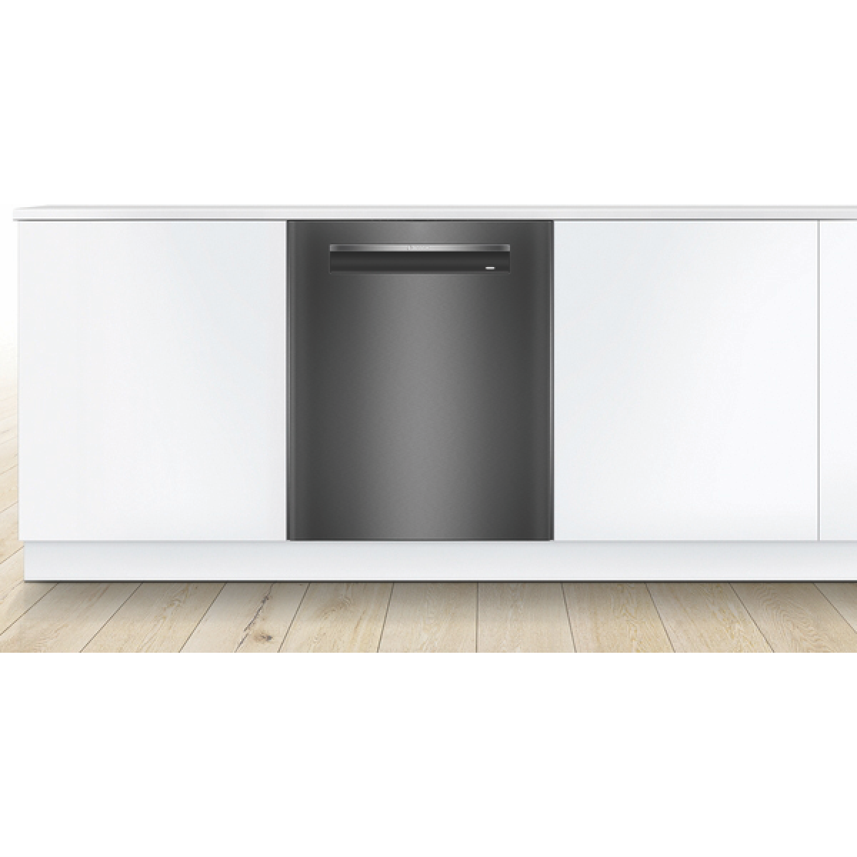 Step into a world of sparkling clean dishes with the Bosch Series 6 Built-Under Dishwasher. This built-under black inox dishwasher packs an array of features into a space-saving design to deliver outstanding wash results. With a generous 15 place setting capacity and 7 wash programs including Eco Auto Gentle Pots & Pans 1 Hour Quick ExtraQuiet and Favourite this Bosch dishwasher adapts to handle any load. The intuitive controls make operation a breeze while special options like Remote Start Extra Dry Intensive Zone HygienePlus and SpeedPerfect allow you to customize cycles to suit your needs. Load a variety of dishes with ease thanks to the adjustable VarioDrawer RackMatic adjustable upper rack and smooth gliding lower rack wheels. Five spray zones provide complete 360° coverage inside the tub to target every item. Run the dishwasher at any hour with a low 44 decibel noise rating for whisper-quiet performance. The built-in AquaStop Plus system prevents leaks and floods providing lifetime protection and peace of mind. Connecting to the HomeConnect app allows monitoring and control from afar via WiFi. With a width of 598mm height of 815mm depth of 573mm and stylish black inox finish this feature-packed Bosch Series 6 dishwasher promises to be your new kitchen ally. The manufacturer's part number for this product is SMP6HCB01A. Bring home the Bosch Series 6 Built-Under Dishwasher for a sparkling clean kitchen.