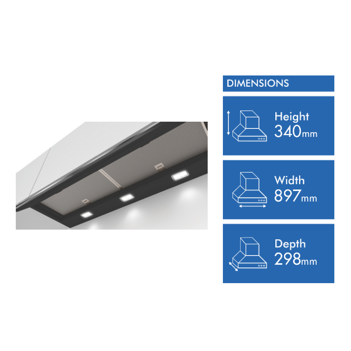 • 90 cm ducted and recirculating with 3x 2W LED lights