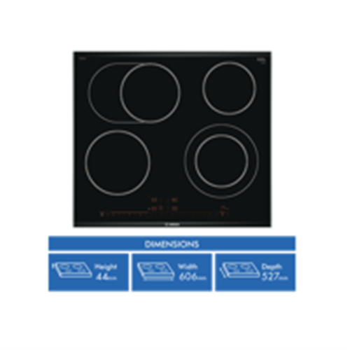 Step up your cooking game with the sleek stylish Bosch 60cm Ceramic Cooktop. This electric cooktop boasts 4 cooking zones to accommodate all your culinary creations. The premium touch controls allow you to precisely adjust 17 power levels while the digital residual heat indicators let you know when areas are still hot for safety. The built-in timer helps you stay on top of cooking tasks. With the child lock feature you can cook worry-free knowing little fingers can't accidentally change settings. The durable black glass surface wipes clean easily and will maintain its good looks for years to come. Additional highlights include the keep warm function to hold dishes at the perfect temperature. This cooktop meets the latest energy standards for efficiency. Measuring 60cm wide it fits standard cutouts for quick and easy installation by a licensed electrician. The manufacturer's part number for this product is PKN675DB1A. Bring restaurant-quality cooking into your home with the Bosch 60cm Ceramic Cooktop.