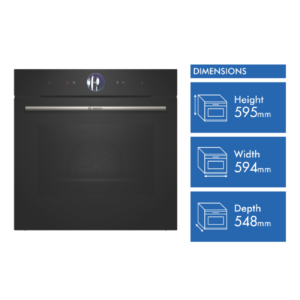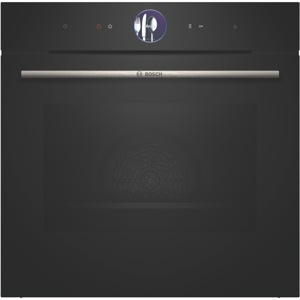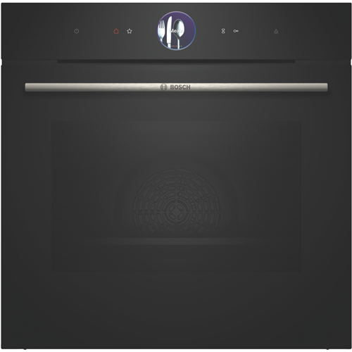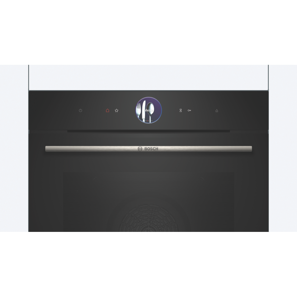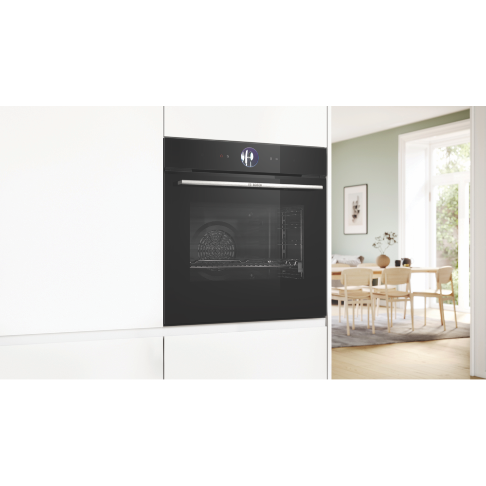 Take your cooking to the next level with the sleek black Bosch Series 8 60cm Pyrolytic Steam Oven. With its generous 71L capacity this multi-function electric oven provides the ultimate in versatile convenient cooking. Fourteen different cooking modes including 4D HotAir AirFry pizza setting and slow cooking cater to all your culinary needs. The intuitive touch controls and programmable timer make operation a breeze. Connect this smart oven to Wi-Fi and utilize the Bosch Assist menu of auto-cooking recipes. Key features like the meat probe rapid heating and LED lighting further enhance functionality. The pyrolytic self-cleaning takes the effort out of maintaining this appliance. Accompanying accessories such as the Air Fry & Grill tray combination grid and universal pan maximize your cooking potential. With a two-year manufacturer's warranty providing peace of mind this Bosch Series 8 Pyrolytic Steam Oven will be the standout appliance in your kitchen. The manufacturer's part number for this product is HRG776MB1A. Check out this Bosch steam oven today for convenient versatile cooking.
