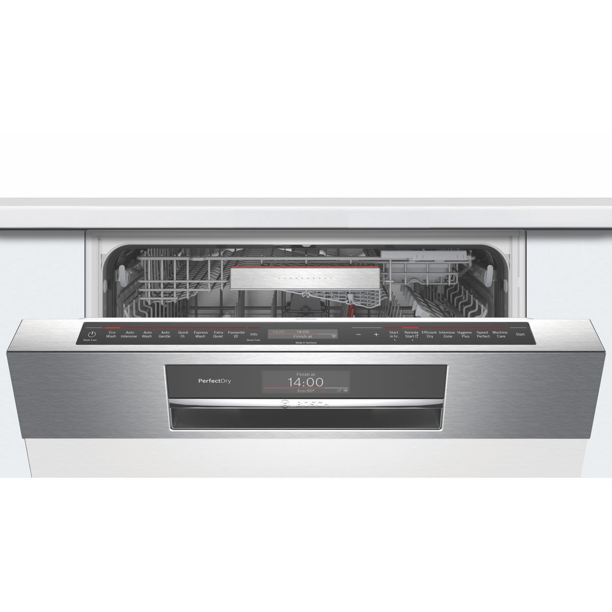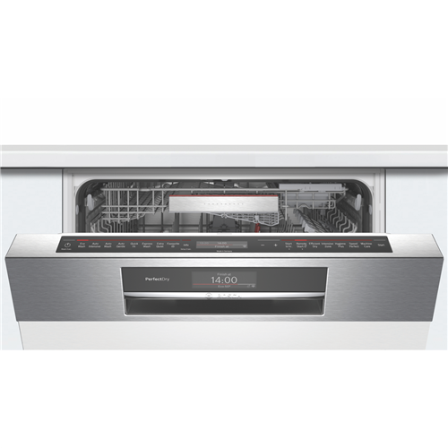 This feature packed Wi-Fi connected Bosch Series 8 Semi Integrated Dishwasher SBI8EDS01A offers total stacking flexibility expertly cleans and dries large loads using minimal resources and allows for remote operation via an app to bring a whole new level of convenience to your every day. A 14-place setting holds plenty of plates bowls cups and serving dishes in various sizes thanks to the upper RackmatickPlus basket that can be height adjusted in three ways to make it fit and VarioFlex red touchpoints that easily let you know which plate racks in the upper or lower baskets can be folded to accommodate them. Plus an Extra Space third rack makes room for oddly-shaped utensils and breakfast bowls so you can wash more at once. This Bosch dishwasher utilises just 11.5 litres per wash on the Eco program with a cold-water connection. It has a 4 Star Energy Rating and a 5 Star WELS Water Rating WELS Licence Number D02597. Eight programs have every cleaning requirement covered from automatic sensor-controlled cycles to shortened wash programs while available options such as SpeedPerfect will reduce cycle time and Efficient Dry will see the door automatically open at cycle completion for improved drying and energy efficiency. With the Bosch Home Connect app on your smartphone review the Easy Start best program recommendations based on your input on the type of dishes and cleaning preference option selected view the estimated water and energy consumption of each program or adjust a wash option even after the program has started.
