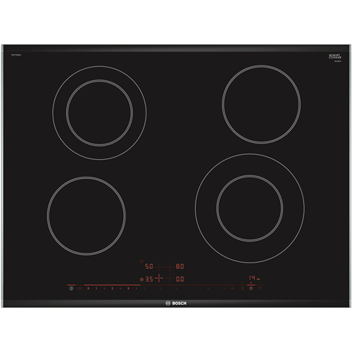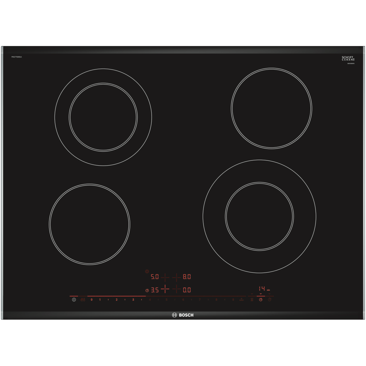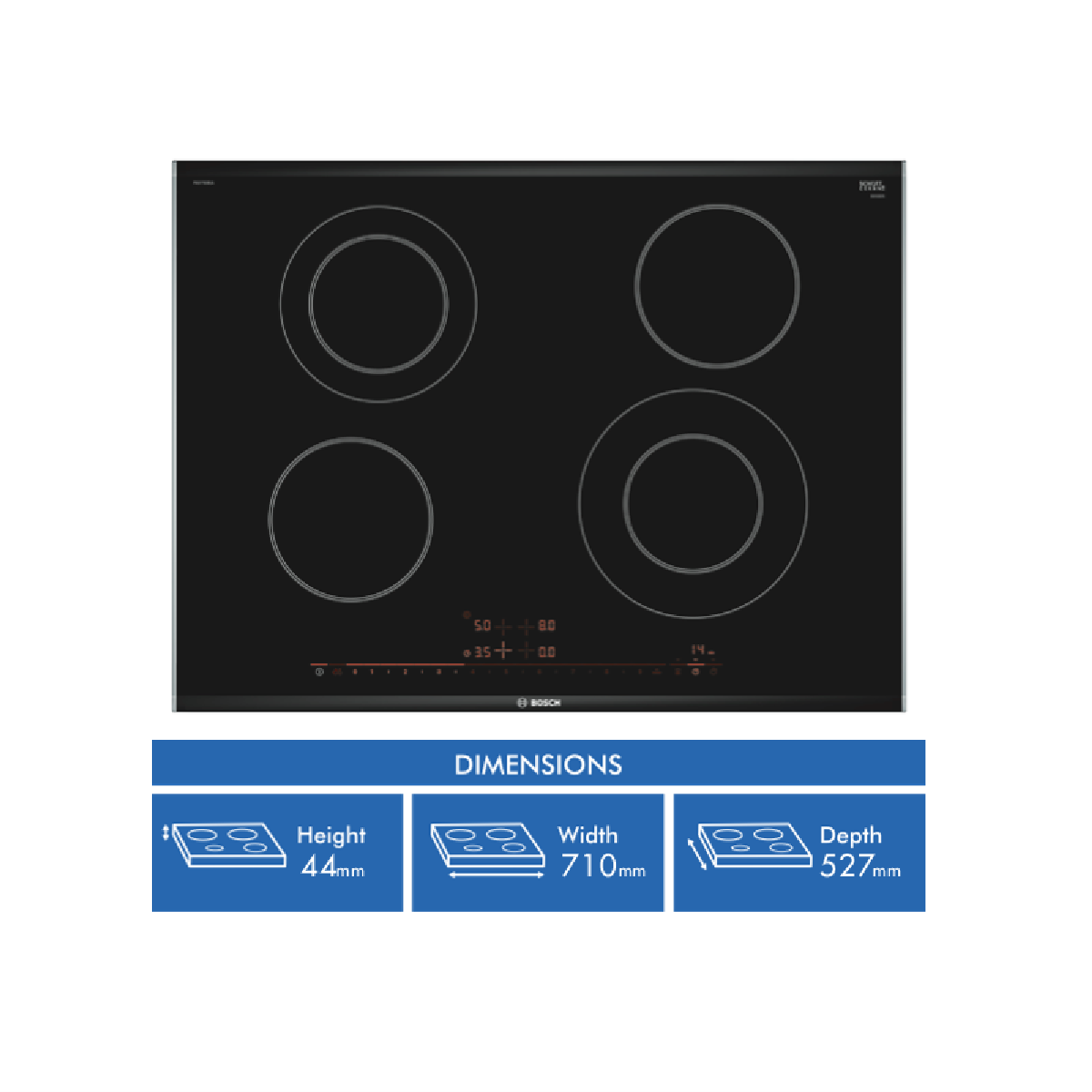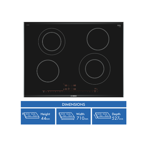 Bring sleek modern style to your kitchen with the Bosch 70cm Ceramic Cooktop PKG775DB1A. This elegant electric cooktop features 4 cooking zones to accommodate all your culinary creations. The brushed black ceramic glass finish adds a sophisticated touch. With 17 power levels you can fine-tune heat with precision while the touch controls offer effortless operation. Keep food warm with the convenient Keep Warm function and quickly reinstate previous settings using ReStart. The timer helps you stay on top of cooking tasks. Safety features like child lock automatic switch off and residual heat indicators give you peace of mind. With a width of 710mm height of 44mm and depth of 527mm this cooktop fits most standard cutouts. The ceramic surface makes cleaning a breeze. Bring out your inner chef with the versatile Bosch 70cm Ceramic Cooktop PKG775DB1A. Backed by a 2 year manufacturer's warranty. The manufacturer's part number for this product is PKG775DB1A. Transform your kitchen today.