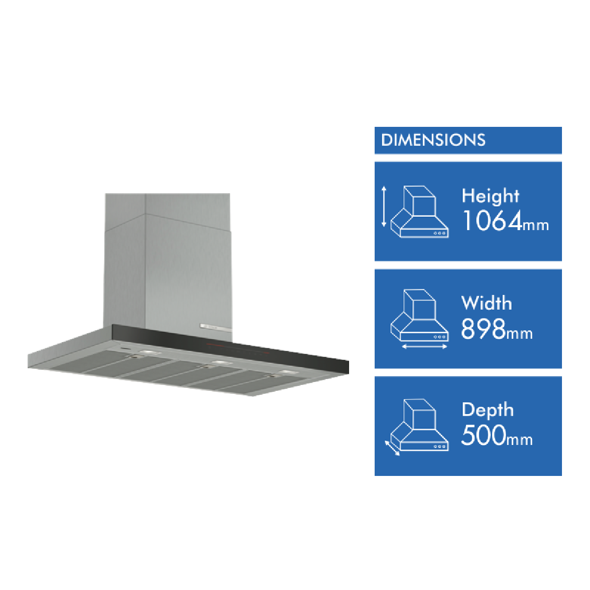 This Bosch 90cm stainless steel canopy rangehood is perfect for powerful yet quiet extraction in your kitchen. Featuring a sleek wall-mounted design this rangehood's EcoSilence brushless motor offers ultra-quiet performance at just 45-64 decibels while still delivering an impressive 964 cubic meters per hour of extraction capacity. With intuitive touch controls and 5 fan speeds (including 2 intensive settings) you can easily adjust the airflow to suit your cooking. The integrated LED lights illuminate your cooktop brilliantly. With 3 dishwasher-safe stainless steel filters keeping your rangehood clean is a breeze. The one-way flap prevents outside air from entering your kitchen. Measuring 898mm in width 628mm in height and 500mm in depth this rangehood will suit most 90cm cooktops and ranges. It can be installed for ducted or recirculated operation giving you flexibility for your setup. Covered by a 2 year manufacturer's warranty this Bosch rangehood combines high-powered performance ultra-quiet operation and a stylish design to keep your kitchen fresh and breezy. The manufacturer's part number for this product is DWB91PR50A.