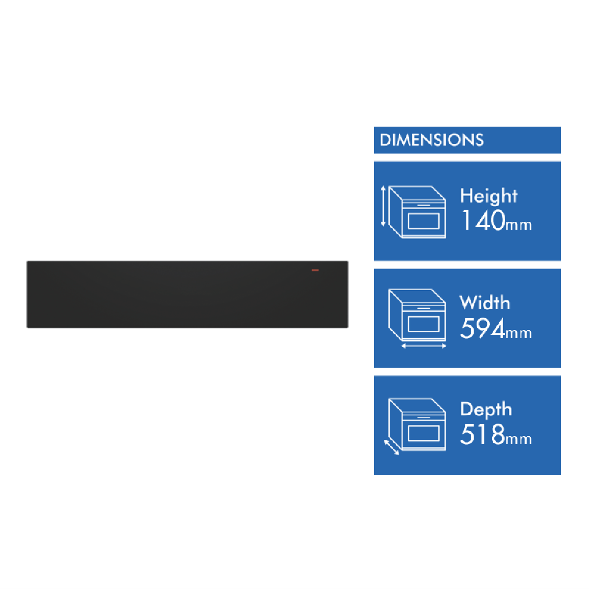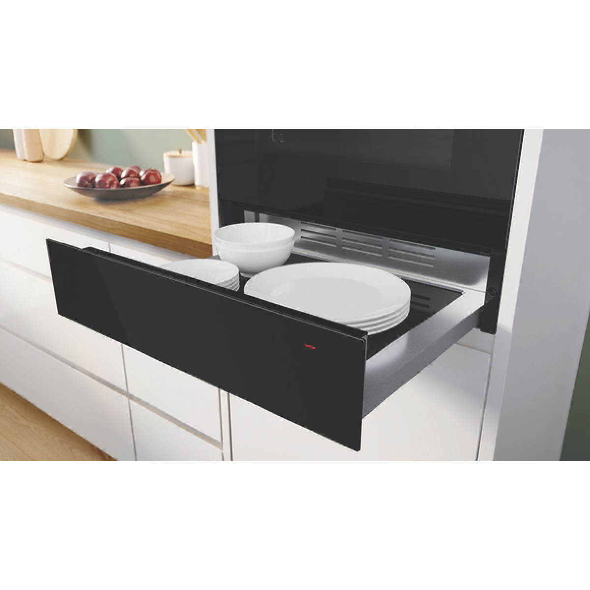 Bring elegant sophistication to your kitchen with the Bosch Series 8 Accentline 14cm Multifunctional Warming Drawer. Crafted in sleek black with a premium glass front this stylish appliance keeps your plates dishes and cups at the perfect temperature so you can serve every meal just right. With generous 60cm width and 12 plate capacity you'll have room to warm full dinner sets while the adjustable temperature lets you get every dish ready at once. Use it to gently heat plates and bowls before serving keep cooked food warm until you're ready to eat prove dough defrost frozen items slowly and more. Designed for seamless built-in installation and everyday use this warming drawer features soft-close gliding rails and a convenient push-pull opening mechanism. Covered by Bosch's 2 year warranty for added peace of mind.