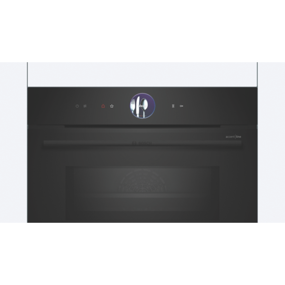 Take your cooking to the next level with the sleek black Bosch Series 8 Accentline 45cm combination microwave oven. With a spacious 45L capacity and 900W of power this versatile appliance makes meal prep a breeze. The intuitive touch control panel and TFT display allow you to easily select from 20 heating methods like AirFry grill defrost and more. The 4D HotAir function and Air Fry technology let you achieve deliciously crispy results when baking or roasting while the auto cook menus and oven assistant with voice control provide guidance for achieving perfect results every time. With advanced features like residual heat indicator and actual temperature display this combination oven takes the guesswork out of cooking. HomeConnect even allows you to control your oven remotely. Bringing style and functionality to your kitchen the Bosch Accentline microwave will inspire you to discover new recipes and cooking techniques. The manufacturer's part number for this product is CMG936AB1A.