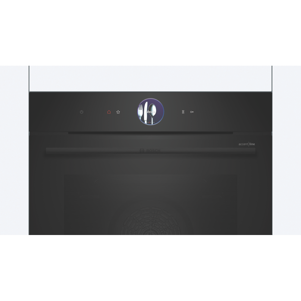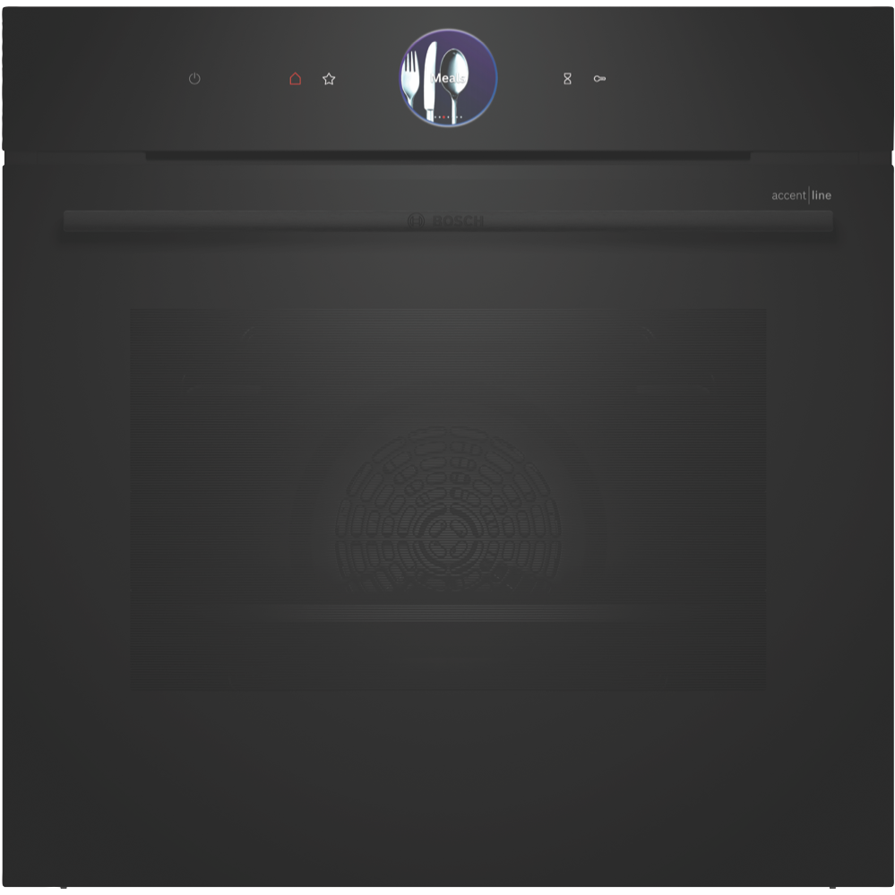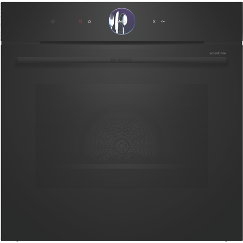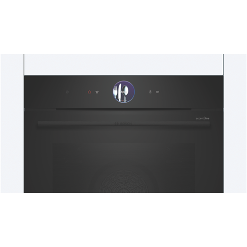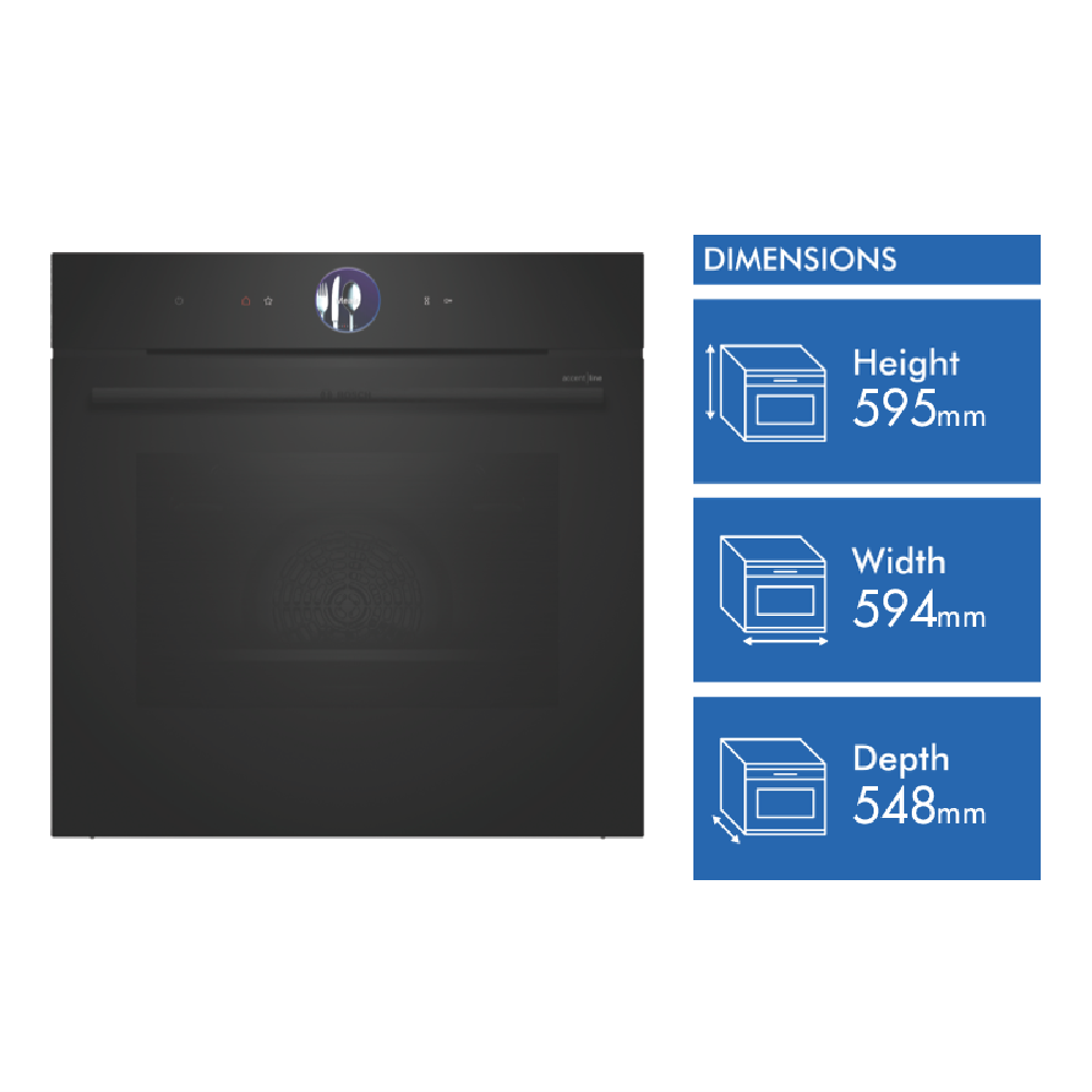 Transform your kitchen with the Bosch Series 8 Accentline 60cm pyrolytic oven designed to deliver exceptional cooking results. With its generous 71 litre capacity fourteen cooking functions including 4D HotAir and AirFry and intuitive touch controls this built-in oven makes preparing delicious meals for the whole family effortless. The carbon black design and anthracite enamel cavity lined with five shelf positions add sleek style to your cooking space. Features like the full-width variable grill pizza setting and preheat and keep warm functions ensure you achieve perfect results every time. With a temperature range from 30°C to 300°C telescopic rails and child lock for safety this Bosch oven combines smart technology with durability. The inclusion of accessories like the air-fry grid combination grid and universal pan enhance your cooking possibilities. Backed by a two year manufacturer's warranty the Bosch Accentline oven will be a workhorse in your kitchen for years to come. The manufacturer's part number for this product is HBG976MB1A. Learn more about the capabilities of this multi-function oven today.