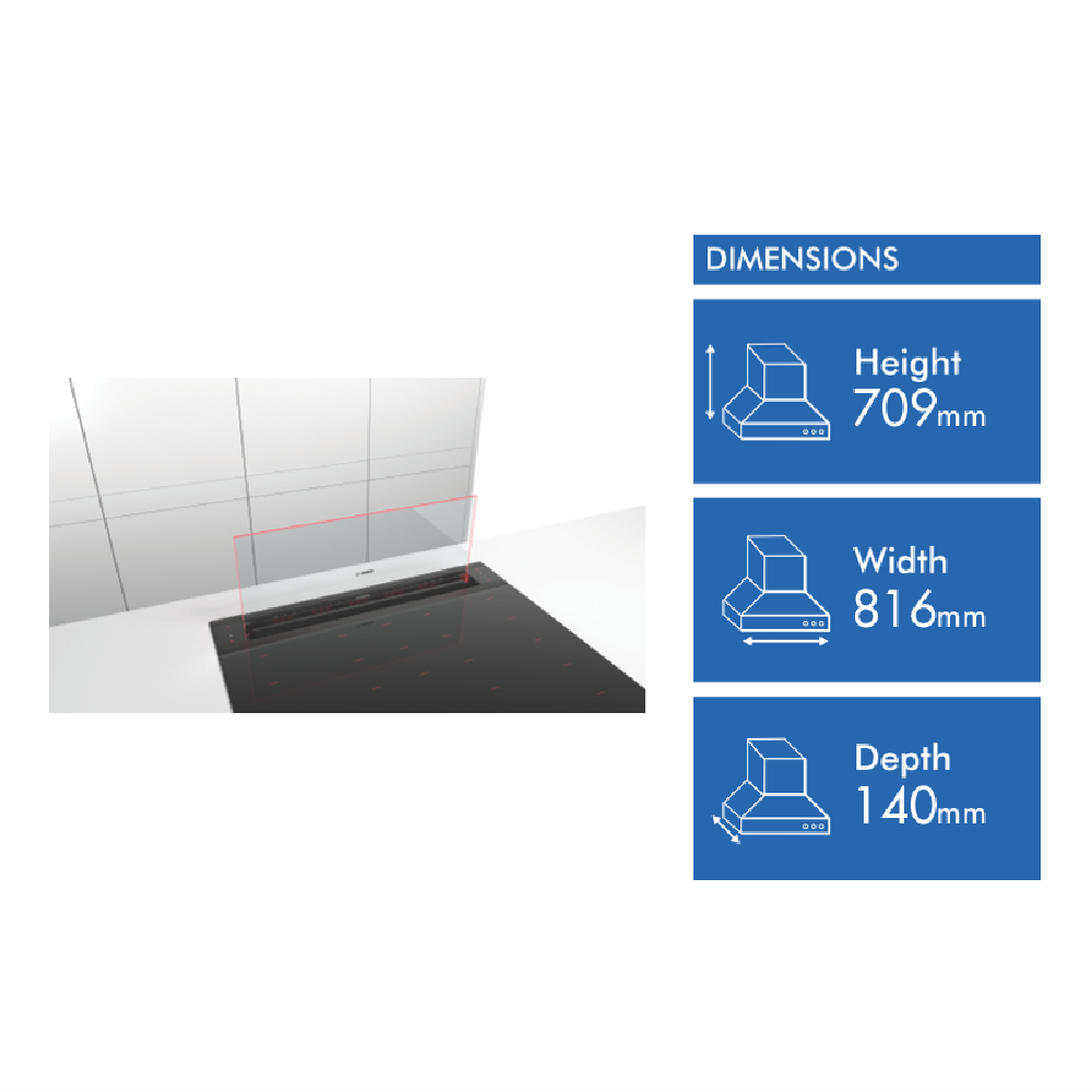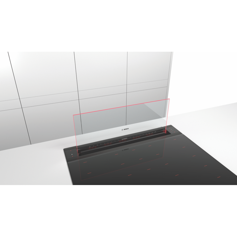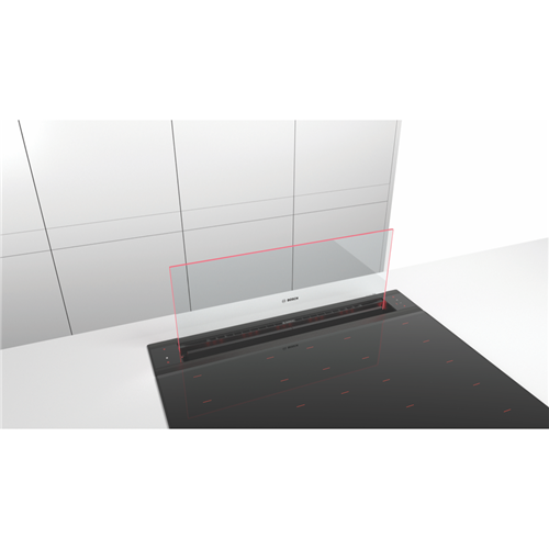 A sleek and modern addition to your kitchen the Bosch Series 8 Accentline 80cm Downdraft Hood brings intelligent ventilation to your cooking space. With a concealed fan and minimalist glass fascia this downdraft hood makes a sophisticated statement while quietly eliminating steam grease and odors. The extraordinary glass design is equipped with accent lighting that illuminates your cooktop in your choice of color. With three fan speeds and 775 cubic meters per hour of extraction capacity this hood adapts to everything from simmering to high-heat cooking. For installation in an island or semi-island kitchen it retracts out of sight when not in use. This downdraft hood combines advanced technology like Home Connect allowing remote monitoring and control via smartphone or tablet. Visualize this elegant yet powerful downdraft hood enhancing your cooking experience. The manufacturer's part number for this product is DDW88MM66. Discover how the Bosch Series 8 Accentline Downdraft Hood can transform your kitchen today.