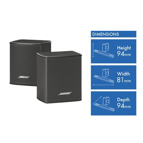 Experience the impact of explosions crashes and loud sound effects around you with the Bose Surround Speakers 809281-5110. Optimised to exclusively pair with the both Bose Soundbar 500 and Bose Soundbar 700 the Surround Speakers provide sweeping and atmospheric sound to your favourite music movies sports and TV shows. Set-up is simple with the speakers wirelessly connecting the Bose Soundbar 500 or 700 via the included wireless receivers. Standing just below 10cm the Bose Surround Speakers compliment your existing home entertainment setup with consistent high quality audio.