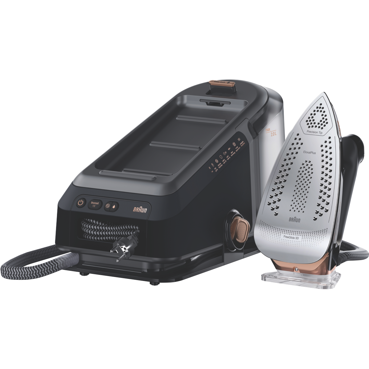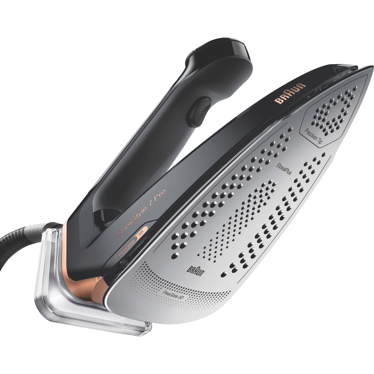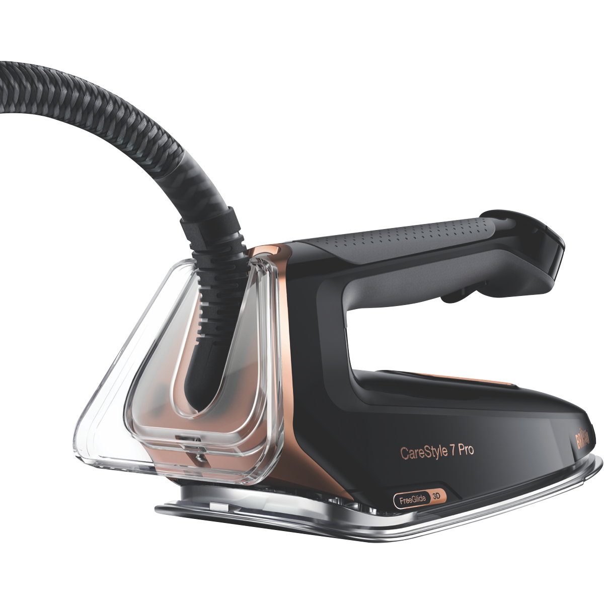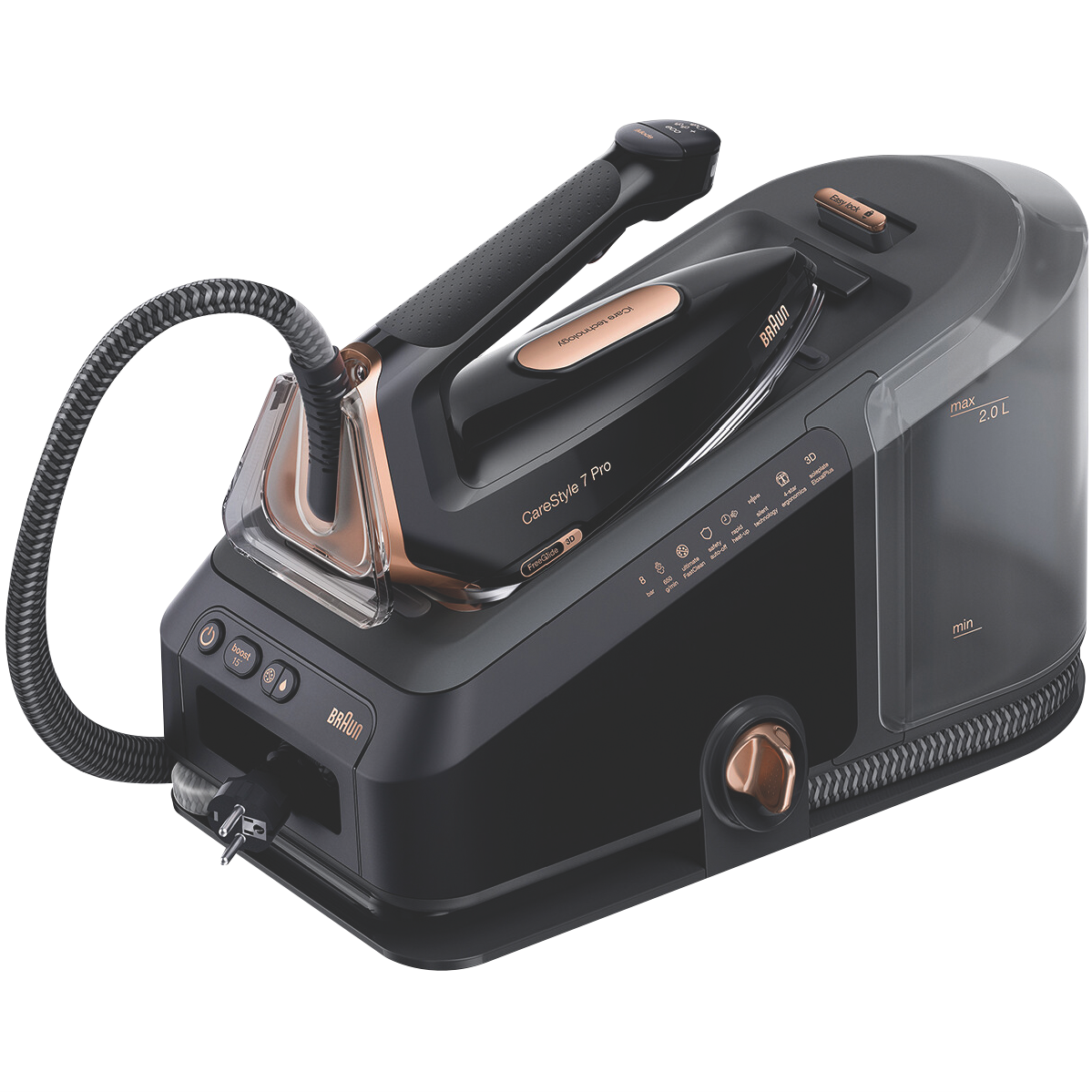 Transform your clothes into freshly pressed perfection with the Braun CareStyle 7 Pro Steam Station. This powerful steam station features Braun's FreeGlide 3D soleplate that glides effortlessly over fabrics for smooth results. With its 2400 watts of power it delivers a constant 170g/min of steam or a powerful 650g/min steam shot to tackle even the toughest wrinkles. The large 2L removable water tank allows longer steam sessions without refilling while features like Eco Mode Turbo Mode and iMode Technology provide customised steaming for all fabric types. Silent Technology keeps it quiet when in use and the EloxalPlus base offers exceptional durability. An auto shut-off function provides added safety and peace of mind. With vertical steaming capabilities fast descaling and a 3-year warranty the Braun CareStyle 7 Pro Steam Station makes quick work of wrinkles and creases so you can achieve crisp fresh garments in no time. The manufacturer's part number for this product is IS7285BK. Give your wardrobe a revitalising refresh and shop the Braun CareStyle 7 Pro Steam Station today.