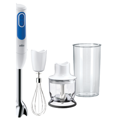 This Braun MultiQuick 3 - 700W Hand Blender is your new all-in-one kitchen tool. It's a hand blender an electric whisk and a chopper so you can get your meal prep done quickly without using multiple appliances to save you space and money. Quickly whip egg whites to stiff peaks with the whisk attachment or for soups and smoothies the blender attachment is the way to go. The Braun MQ3025WH has patented hand blending technology for even results without lumps and anti-splash technology to keep your kitchen looking spotless - the blender's bell shape draws food inwards for smoother blending and fewer lumps in your smoothies. Chopped nuts for sundae toppings or dried apricots for fruit cakes are quickly cut down to size with the 350ml chopper saving you lots of time - and it's all contained neatly so there's no mess to clean up. The MQ3025WH can also chop up an onion in seconds so there are no more tears when trying to achieve a fine dice. Switch between the different accessories quickly and easily thanks to Braun's EasyClick system. Get the results you need with the Braun MultiQuick 3 - 700W Hand Blender thanks to a 700-watt motor so you can power through dense mixes and with 2-speed settings you'll get the perfect consistency time after time. Your meals will practically prepare themselves with the Braun MultiQuick 3 - 700W Hand Blender MQ3025WH.