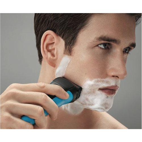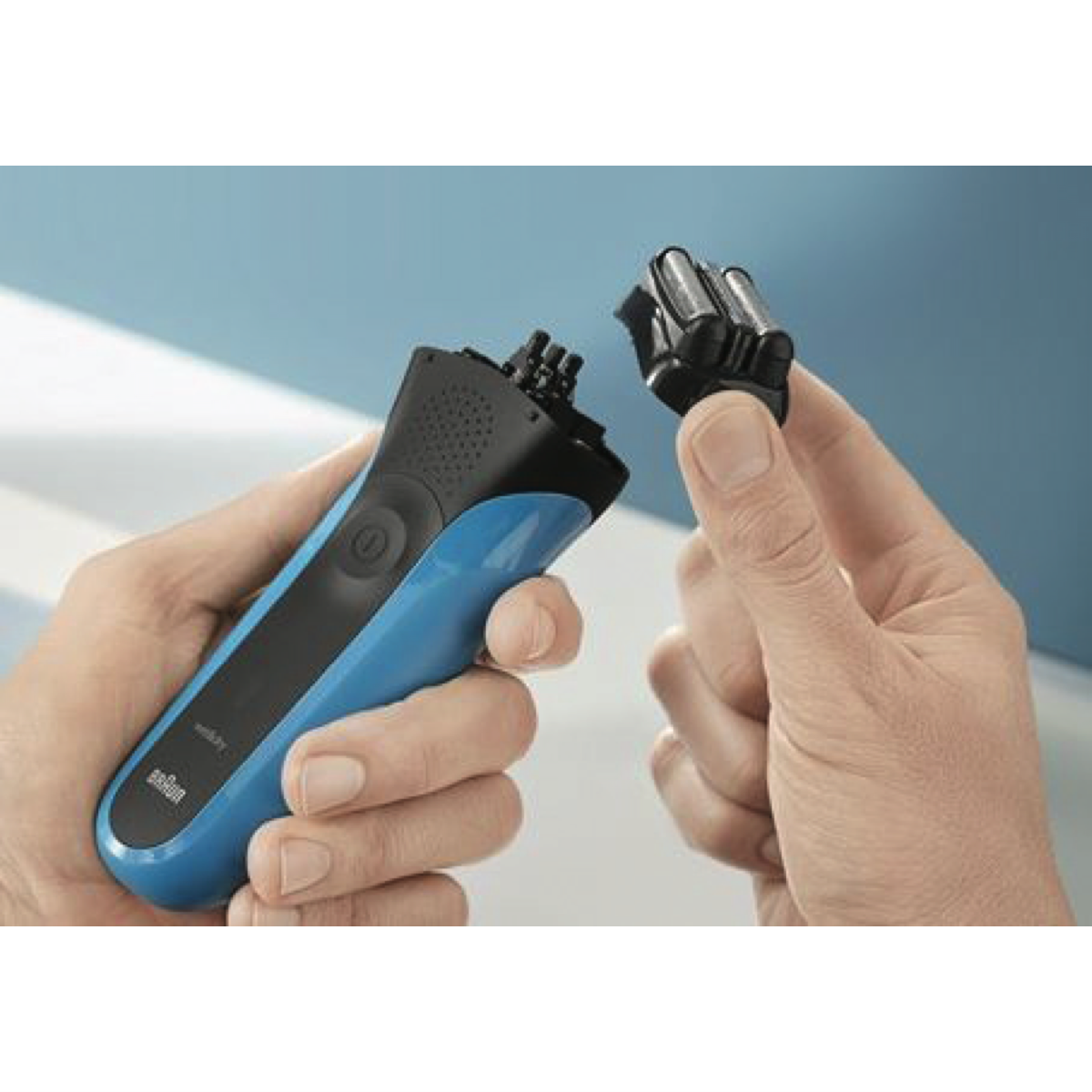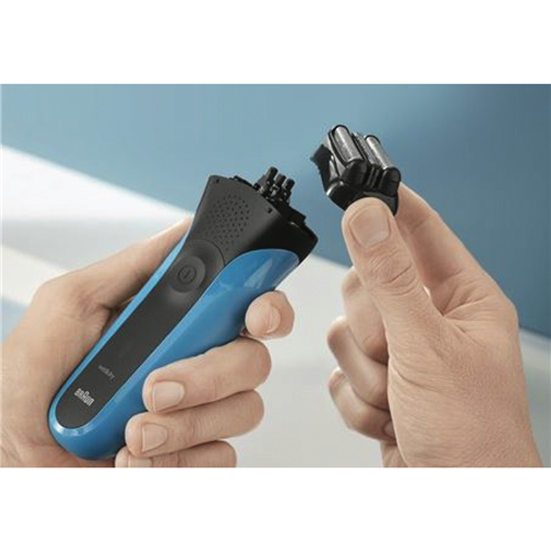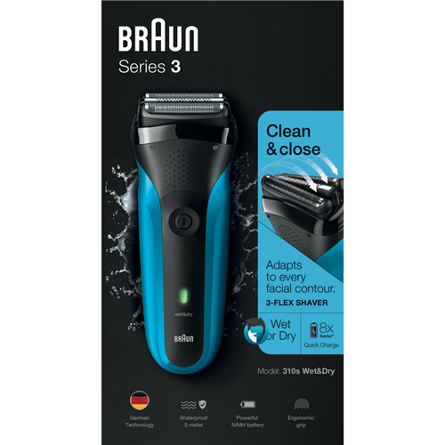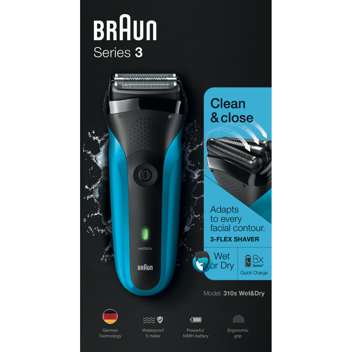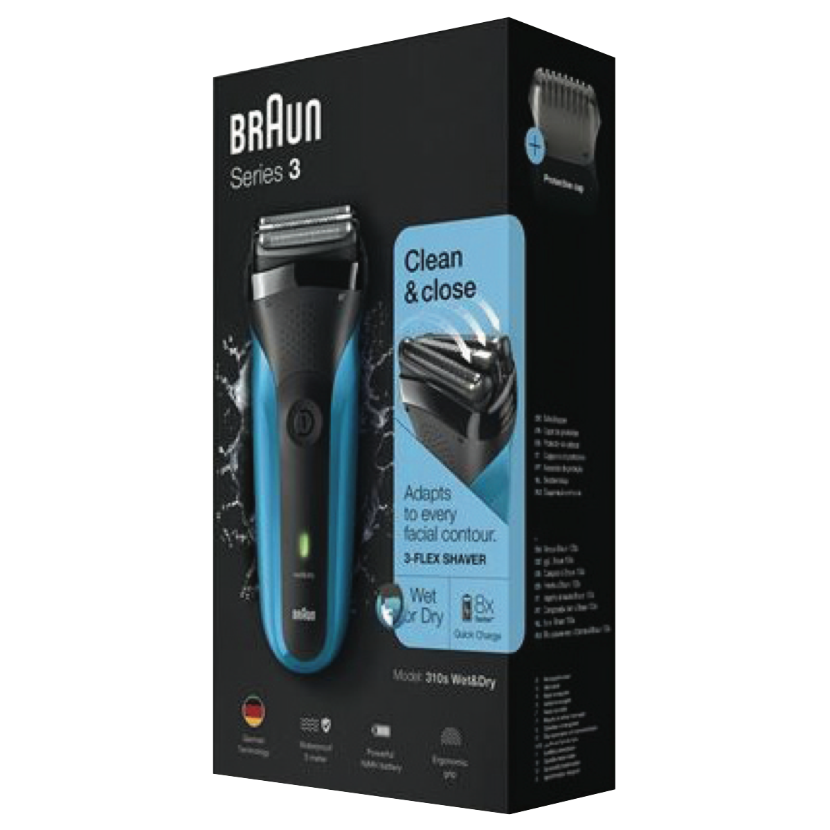 The Braun Rechargeable Wet&Dry Electric Shaver is the perfect grooming tool for the modern man. Powered by rechargeable lithium-ion batteries this electric shaver delivers up to 20 minutes of cordless shaving from a single 1-hour charge. The innovative SensoFoil blades gently glide over skin for a close comfortable shave even on longer beards. Fully waterproof and washable you can shave wet with foam gel or in the shower. An LED display indicates battery status so you know when it s time to recharge. With a sleek black and blue design this shaver looks great on any bathroom counter. Additional features like a built-in trimmer SmartPlug and cleaning brush make this an all-in-one grooming solution. Backed by Braun s 2 year warranty this German-engineered shaver is built to last. The manufacturer's part number for this product is 310S. Give yourself the gift of an easy irritation-free shave with the Braun Rechargeable Wet&Dry Electric Shaver.