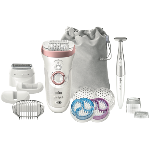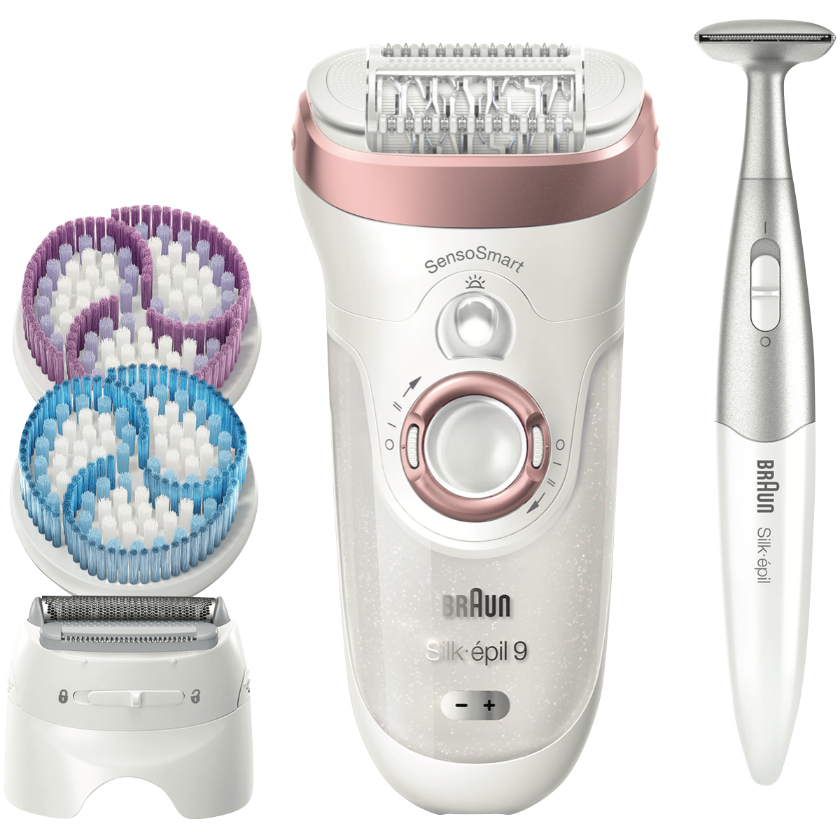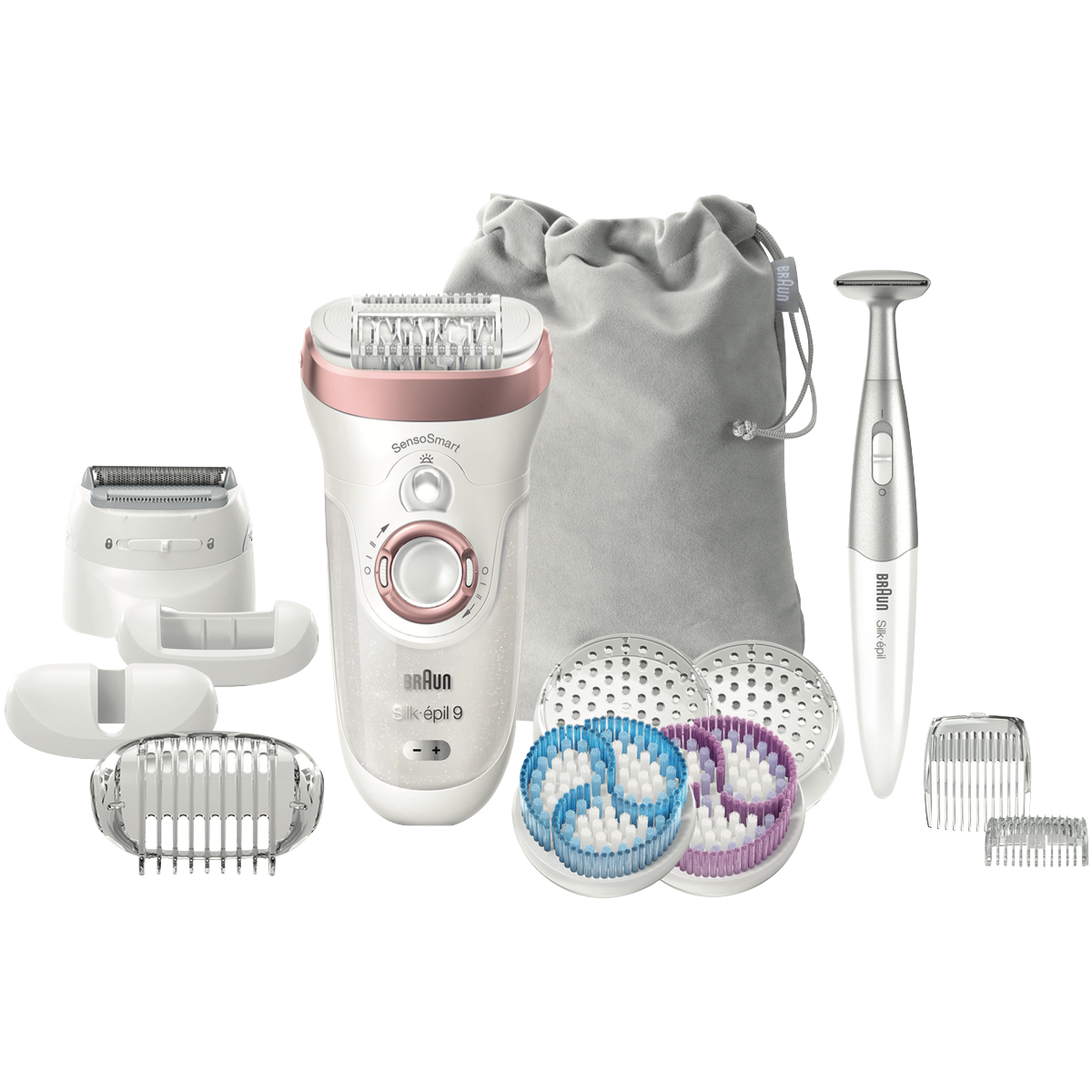 Get ready to say goodbye to unwanted hair and hello to silky smooth skin with the Braun Senso Smart Silk 9 Epilator. This battery-powered epilator features an extra wide head and SensoSmart technology allowing for gentle hair removal and an efficient experience. The wet and dry functionality means you can use it in the shower or bath for convenient hair removal. With two speeds to choose from you can tailor the epilation experience to your sensitivity and comfort levels. The washable head makes cleaning a breeze. Pamper your skin pre and post-epilation with the two exfoliation brush attachments that come included. Achieve precise shaping and trimming of bikini lines and other sensitive areas with the bikini trimmer attachment and combs. Enjoy up to 40 minutes of cordless use from a 2 hour charge. The Braun SensoSmart epilator comes protected by a 2 year manufacturer's warranty for added peace of mind. Achieve smooth hair-free skin on legs arms and bikini area with this versatile epilator. The manufacturer's part number for this product is SE9980. Give this top-rated epilator a try today.